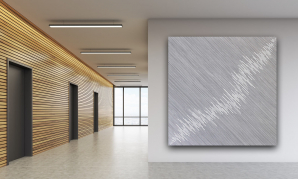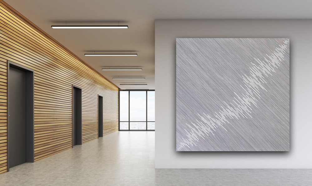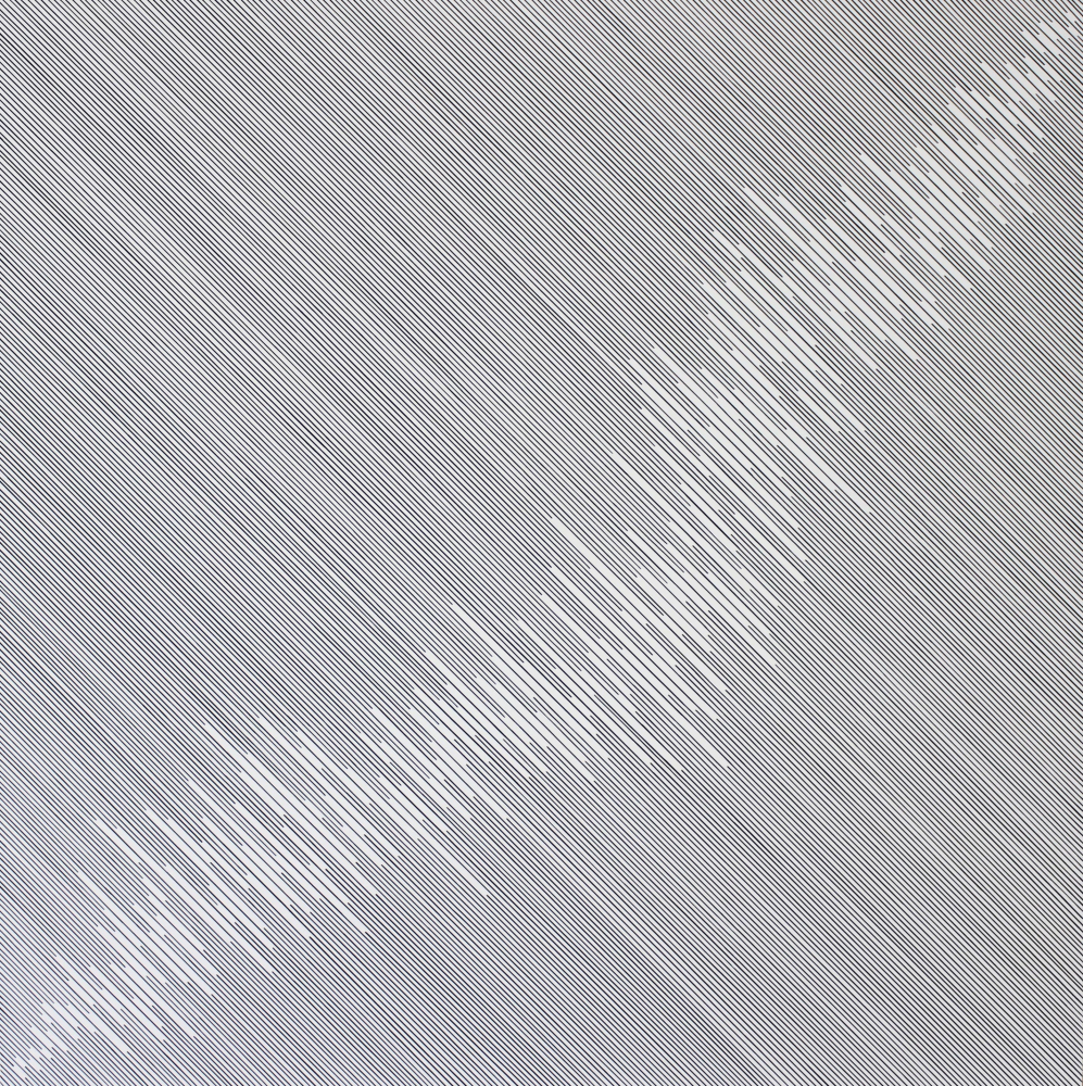 I was concerned with new forms of OP-art in this work. In my research, I was trying to find different ways of visualizing this artistic movement at the present time. Digital images surround us at every turn in the modern world. However, transferring them to the canvas is much more complicated and requires much more patience and devotion. The painting „ Frequencies “ explores the physical properties of lines as well as an evocation of various musical sounds.