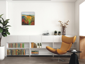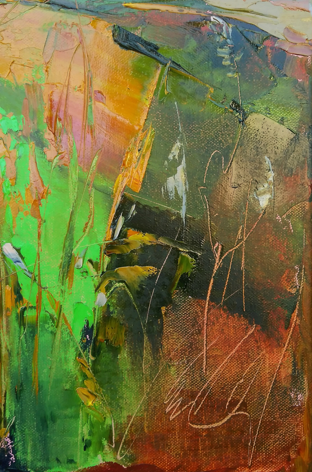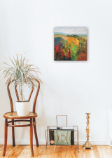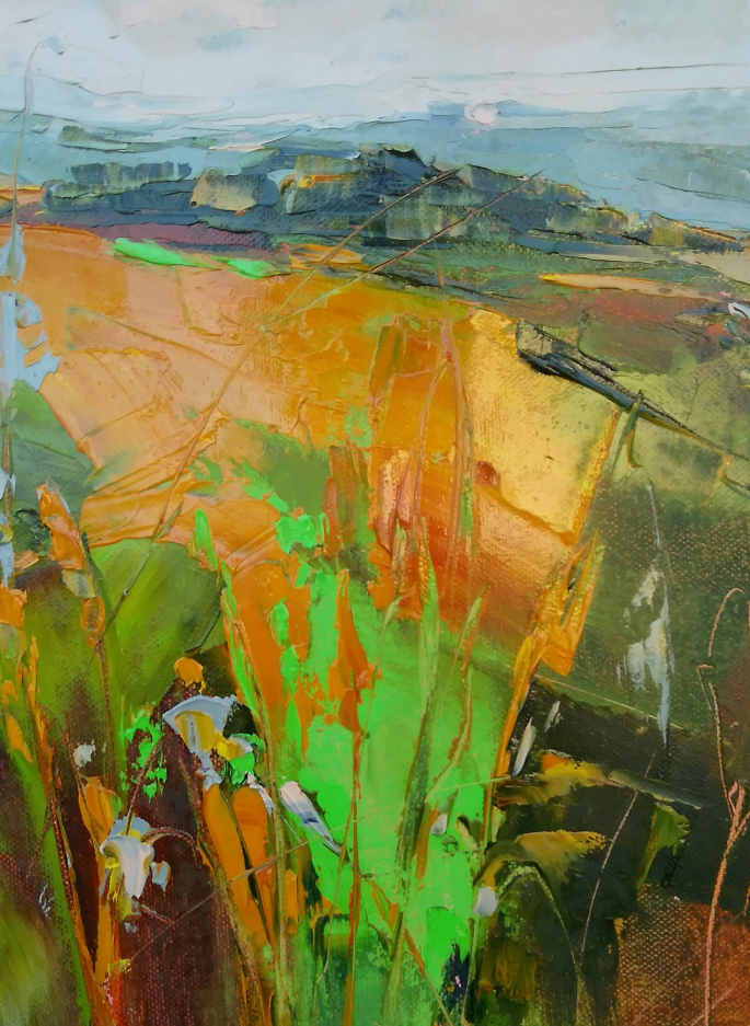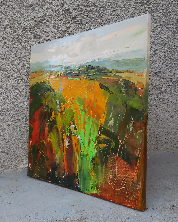 This painting is part of my field series. My freedom-loving personality was always been drawn by the fields. I love the feeling of endless, freedom and reverie that the fields evoke in me. I love painting them. While painting I feel the gentle wind playing all around me, I hear the whispers of the grass, I feel my soul floating towards the horizon… and I am happy. Hope you are too when looking at these paintings.