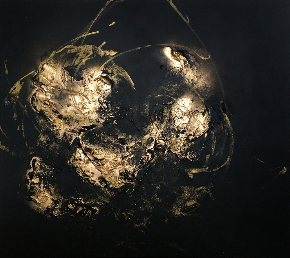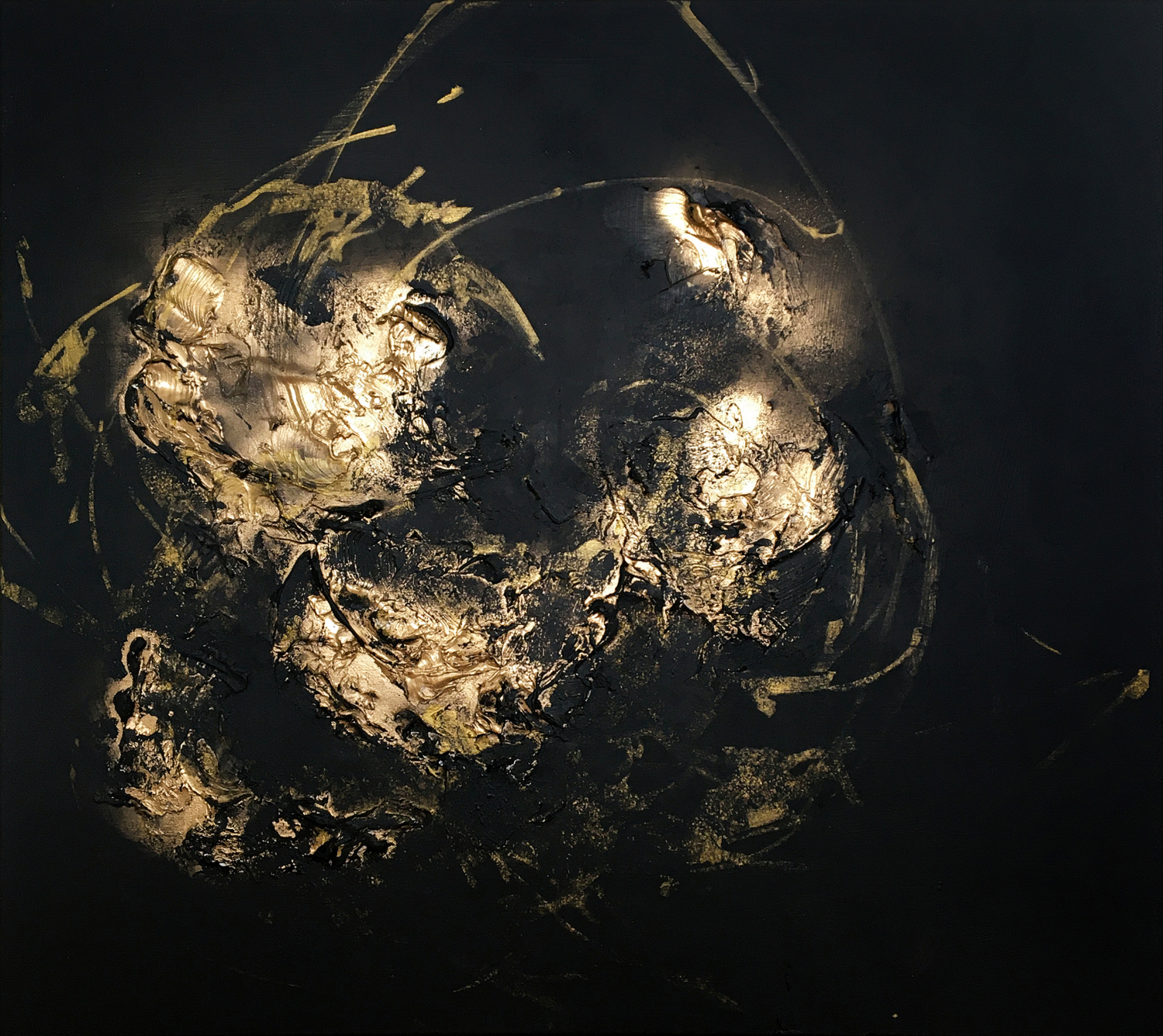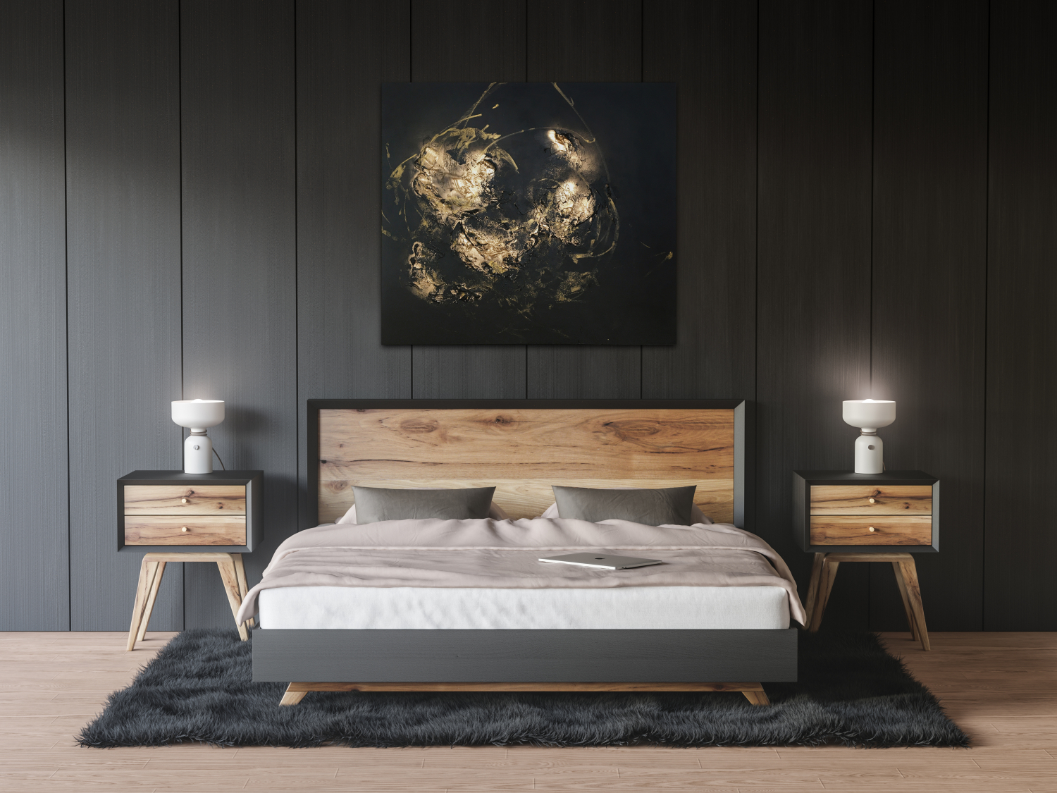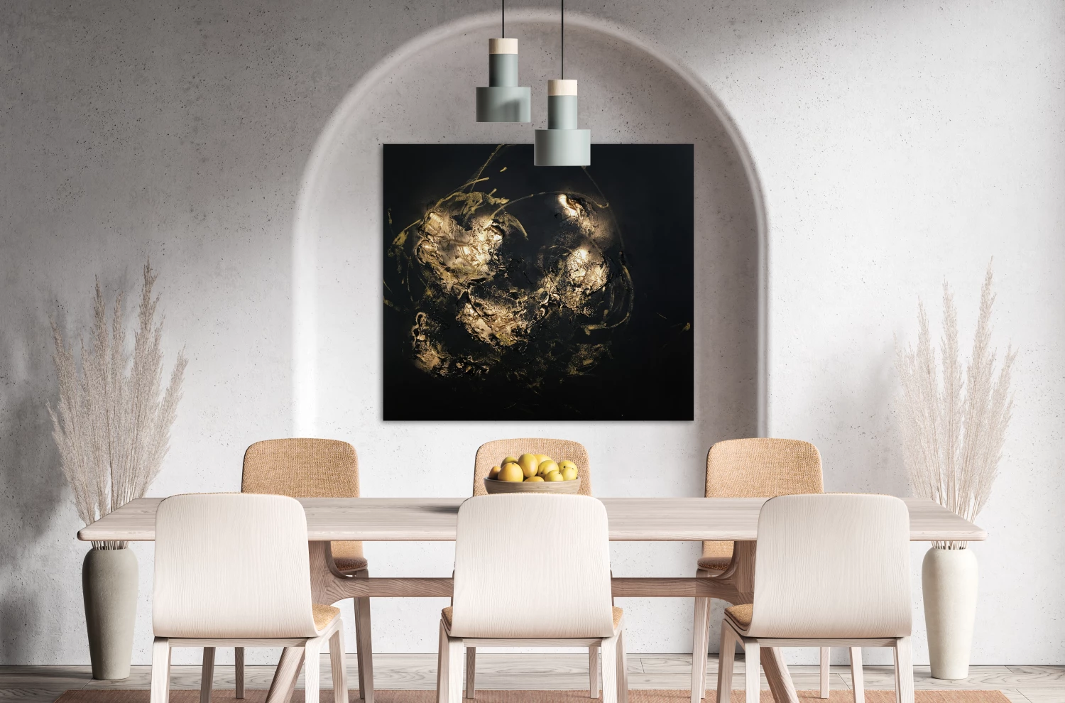 Beautiful timeless decoration for any type of interior. The picture is structured, golden flowers with golden reflections stand out from the matte black background.
