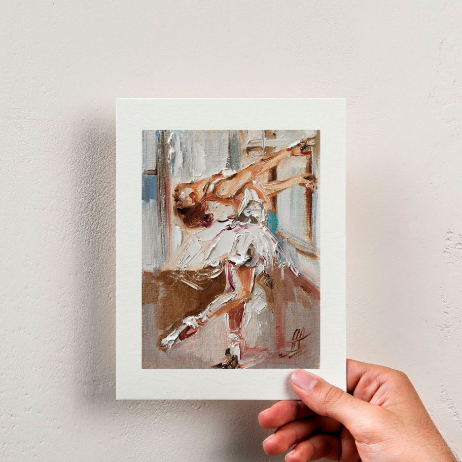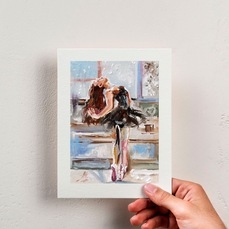 This set of 2 miniature ballet paintings, created in oil on canvas, features textured paint strokes and gentle shades. The paintings depict gracious ballerinas in white and black tutu dresses.