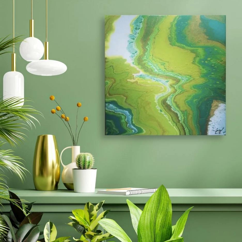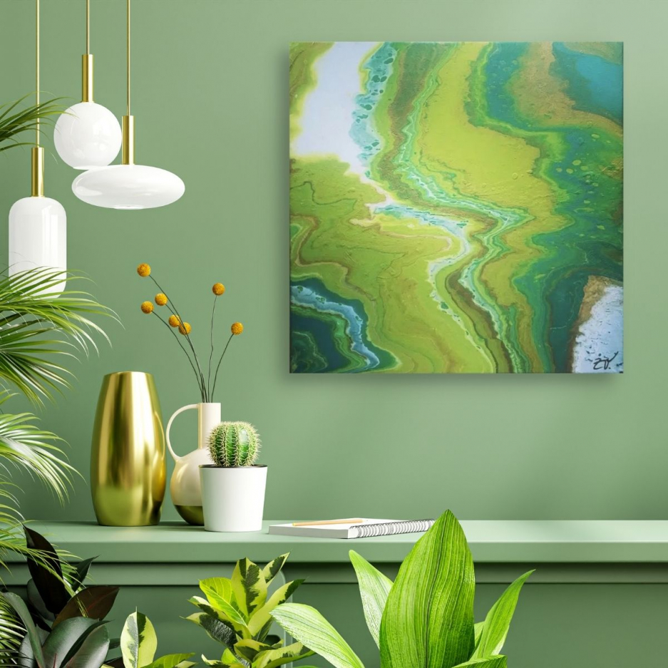 “Green” is an acrylic painting made on canvas. The main colors of the paintings, blue, green and white, create a relaxing atmosphere.