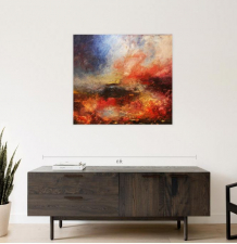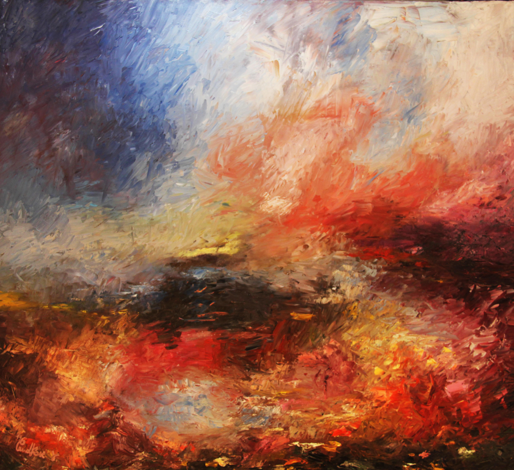 “Heat” is an abstract painting created with oil on canvas. The carefully blended colors on the canvas reflect the title of the piece, “heat”. The juxtaposition between the cool colors of blue and purple with warm colors of red and yellow creates a balance while simultaneously bringing out the heat more. The rough textures of the paint reflect the painful heat of the fire.
