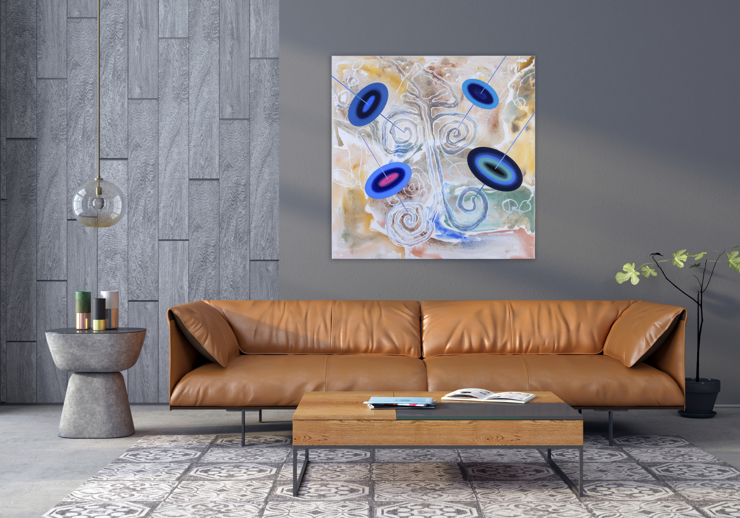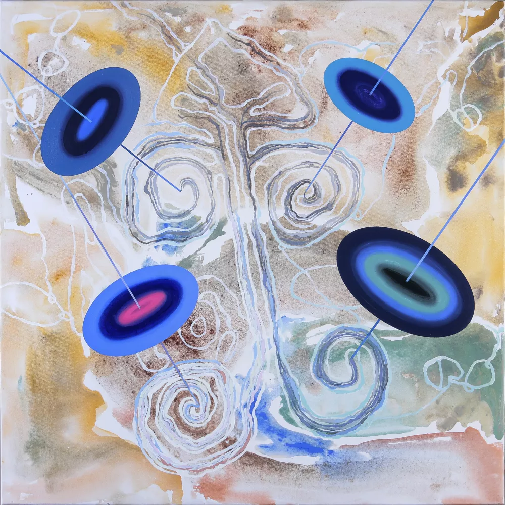 With this in mind, this cycle of paintings represents the collective memory of humanity with all its ups and downs. Focusing mainly on the bright, positive, and energetic strings of life which are occasionally tangled or cut with blurred and darker knots and circles, but then again untangled and all dancing in harmony into eternity. Once again elements representing eclipses of the universe appear in these paintings, symbolizing ever-present fate and cosmic presence influencing everything and everyone.