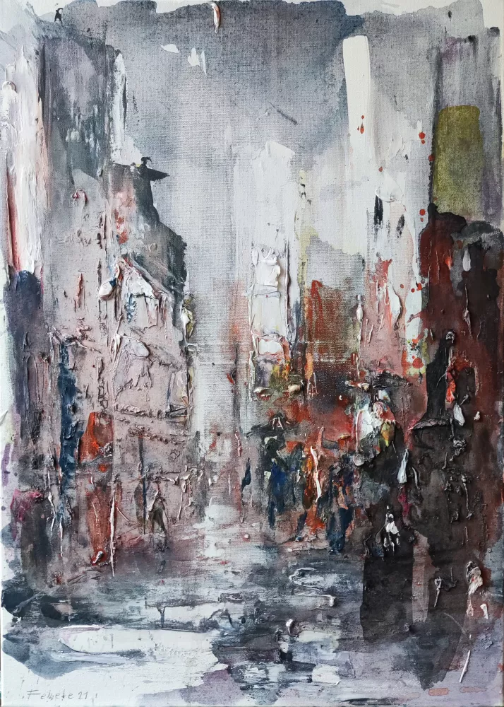 It's time again to think about the world, about my artworks and about everything that makes me happy. Sometimes I sit in front of my picture for a long time and try to crack the safe. I try to see the invisible and that which has flowed into the picture without my will, just in such a way that I would have consciously wanted it. It is the light that is created differently in every picture. It happens by itself and I can't control it. I missed something or I followed other things and didn't deal with them. I decided to control the light in this picture and consciously decide on the effect. It is a dusk and the walls turn red. On the horizon, the buildings rise into the air. However, the sky darkens just in such a way that the light can still spread over the facades of the houses. It's a beautiful atmosphere. It's all the light that makes it all.
