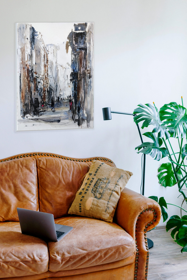 Together we take a walk through the historic, narrow streets in the center of the city. With a little effort we can convert everything that is gray into color. We see people as dark spots between the houses. The sky is clear without clouds. The facades vibrate in the light in our eyes. It is a solemn Sunday mood what this picture gives. I painted him in blue-brown colors. The vertical forms take over the viewer's gaze and lead us to the content of the artwork.