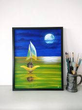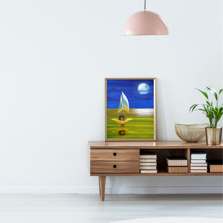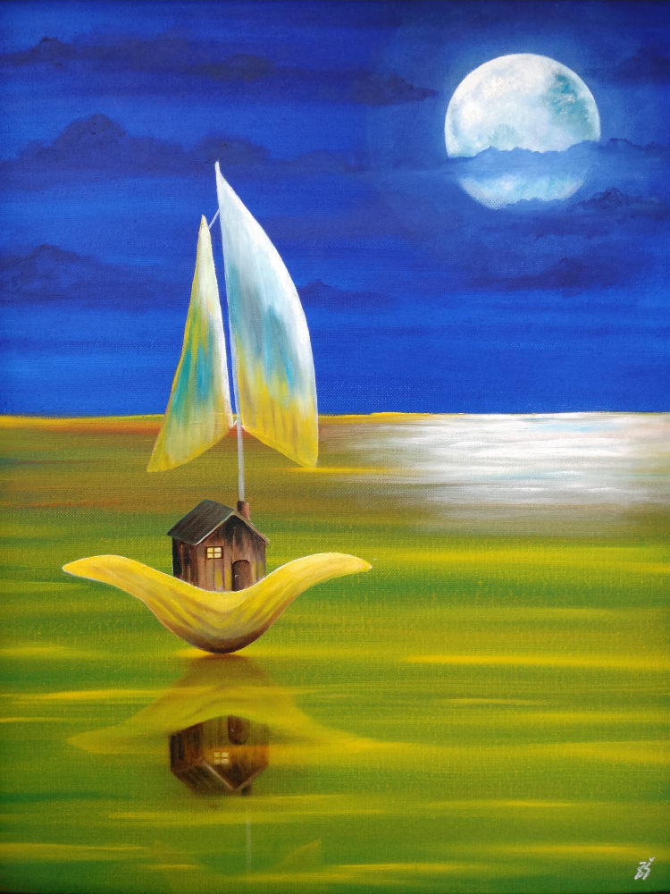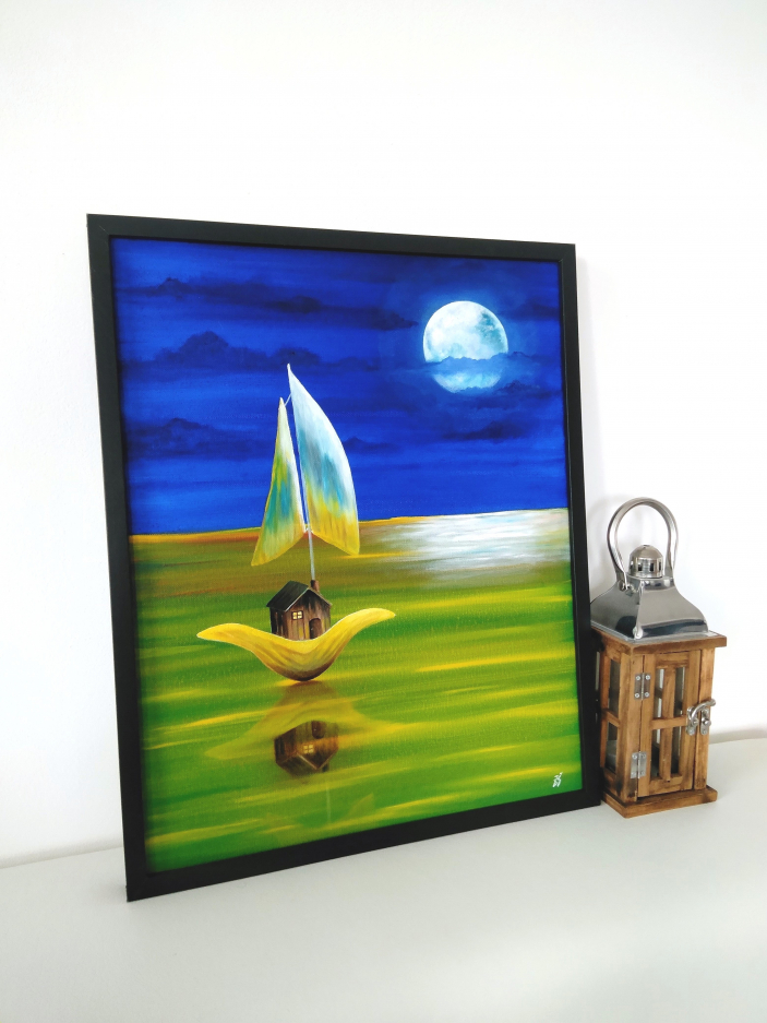 ”House from shell” is an oil painting with surrealistic style and was created on canvas. This painting makes you feel like you are part of a world that exists only in your fantasy. The perfect choice for our forever dreamers… The painting has a dark frame.