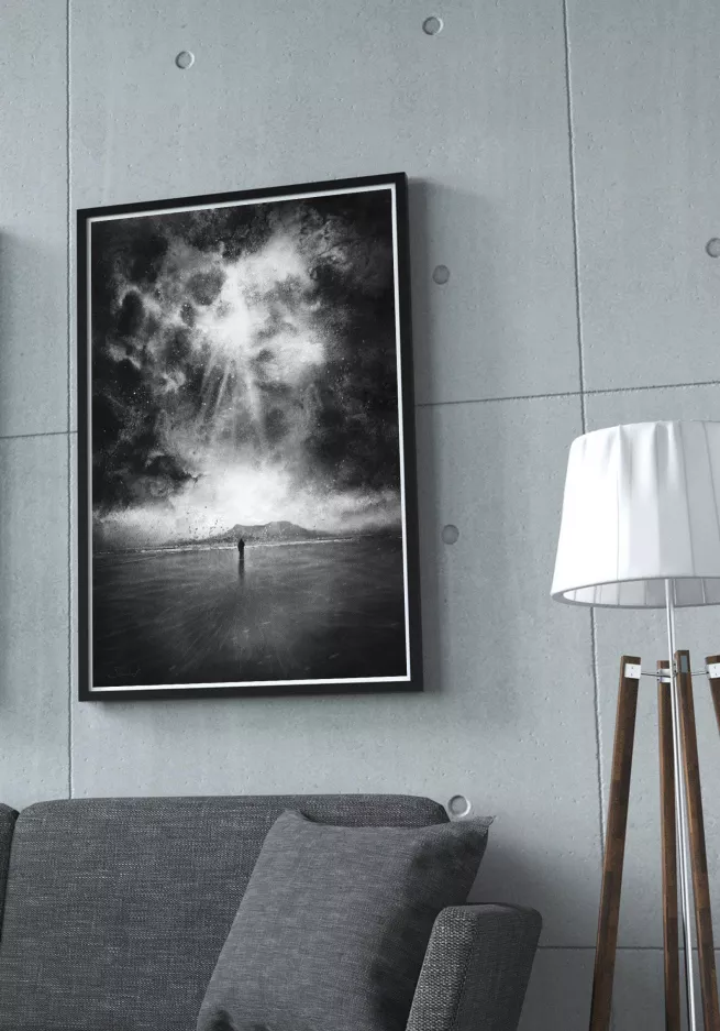 This is a limited edition of 10 printed on natural, heavyweight watercolor paper with high quality and permanent inks. Therefore, the image faithfully reflects the texture and tones of the original work. Each print contains a serial number guaranteeing its originality. It shows a human figure standing unarmed in front of the immensity of the world.