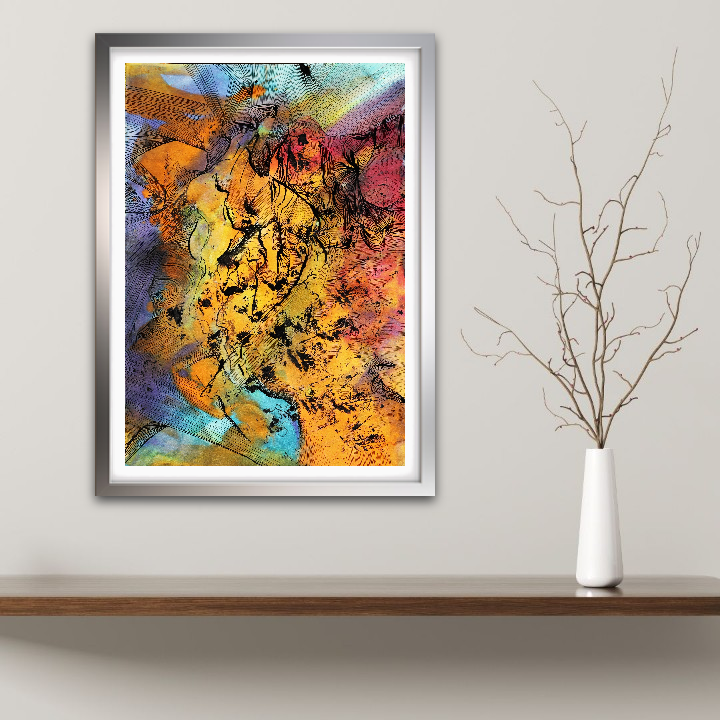 In the cosmic chaos of creation, out of the abstract mixture of colors and lines, the human profile begins to emerge, a possibility that will become true in the future to come.