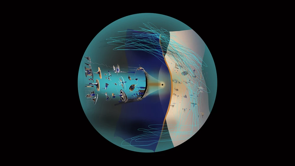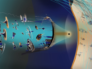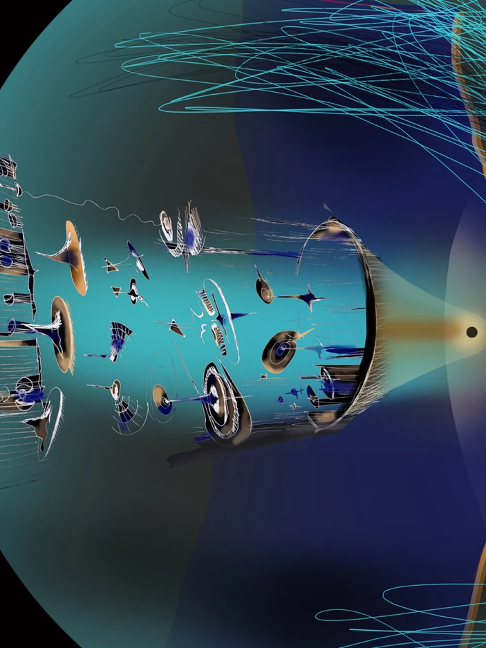 "Frame 37" is a projection that opens the video. It is my graphical interpretation of the M-theory. As a basis for the drawing, I took one of the most intriguing branches of the M-theory, which predicts the Multiverse. In this version, each of the infinite set of universes is a membrane floating in a common eleven-dimensional space. These membranes oscillate and can collide with each other. At the point of collision, a Big Bang occurs, and a new Universe is born. According to this theory, our Universe was also born in the collision of two giant membranes, which occurred 13.7 billion years ago.