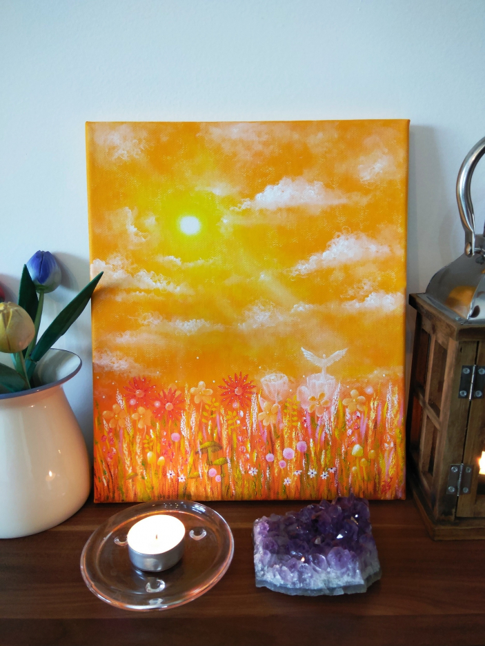 An angel was born. Gentle energy painting of bright orange color with an angelic motif. Guaranteed to brighten up your room.