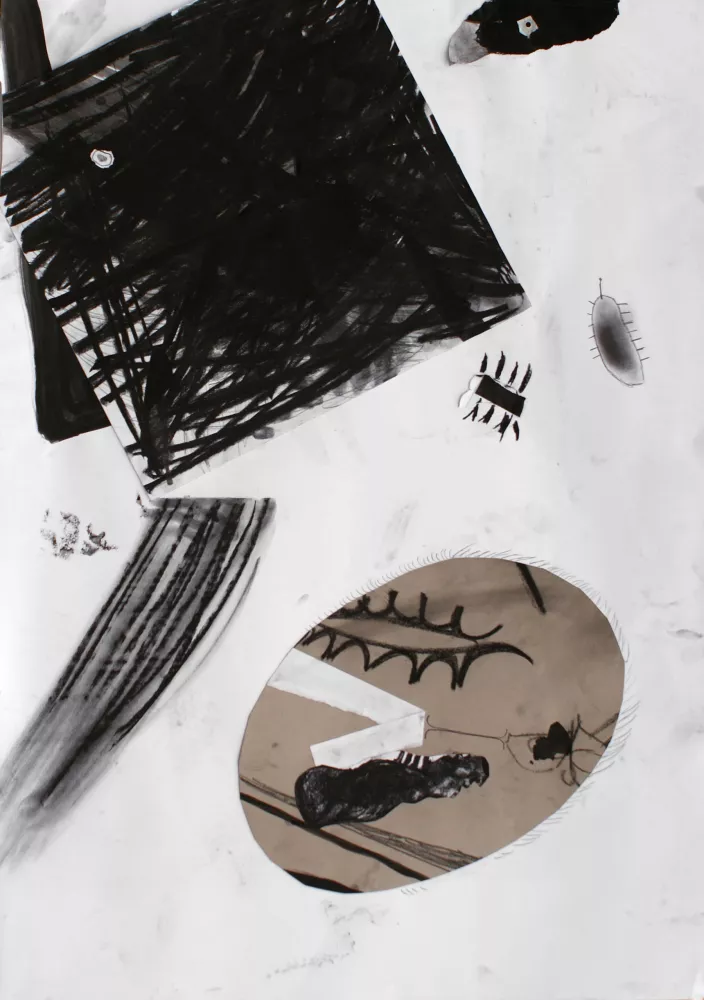 This painting is part of the series “In the hive”. The series consists of paintings made by the technique of paper collage and they follow the style of expressionism.