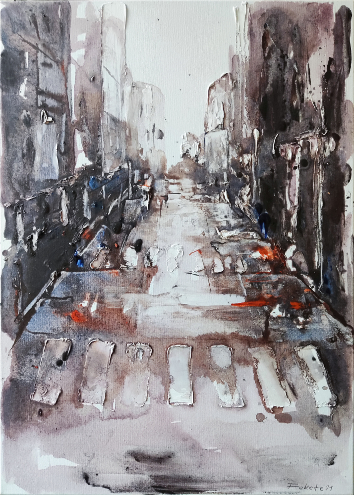 On this work of art, you can see a long street. The houses are very plain and simple. It is an industrial area with a pedestrian crossing. The street is empty. The picture has a central perspective with a very high horizon. You think you're sitting in the car and wanting to drive through. The artwork is decorated in warm colors and this causes a rather evening mood.