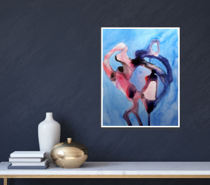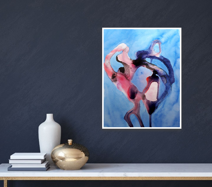 Just dance is an ink painting on paper with an abstract style. This beautiful painting with the colors of blue, purple, and red/rose represents a free flow of ink in an ecstatic image of abstract dance. Dance in the blue, dance to be you!