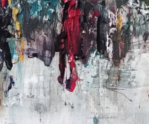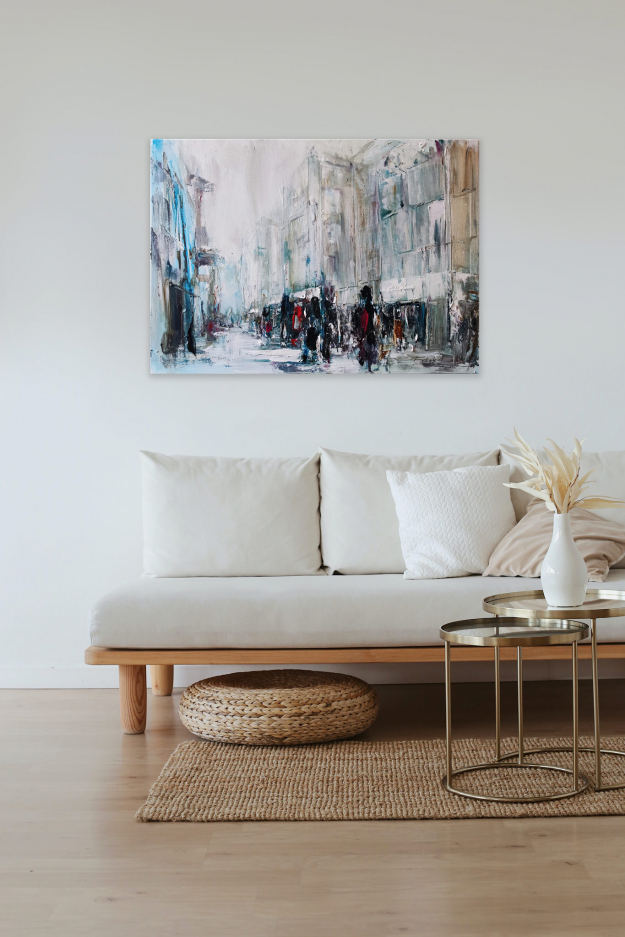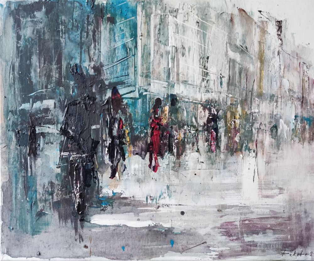 This work of art belongs to the series of pictures that deal with shopping streets in a big city. In its gray-blue colorite, the few colors shine. Krntnerstrae is a popular shopping street in Vienna. The people in the foreground are kept in black, they are depicted very unclear to the viewer. The perspective of the image leads the eyes of the viewer into the depths and stimulates the imagination. The atmosphere is cold and there is snow on the road.