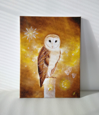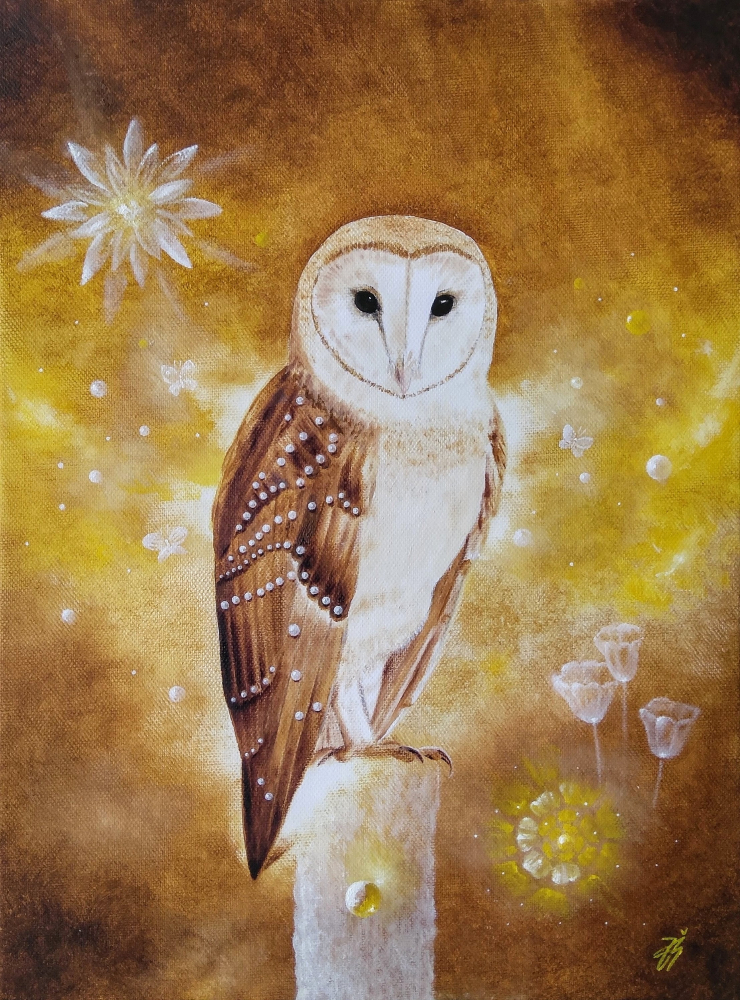 Oil painting of owl guarding a golden pearl. It has small pearls on its wings.