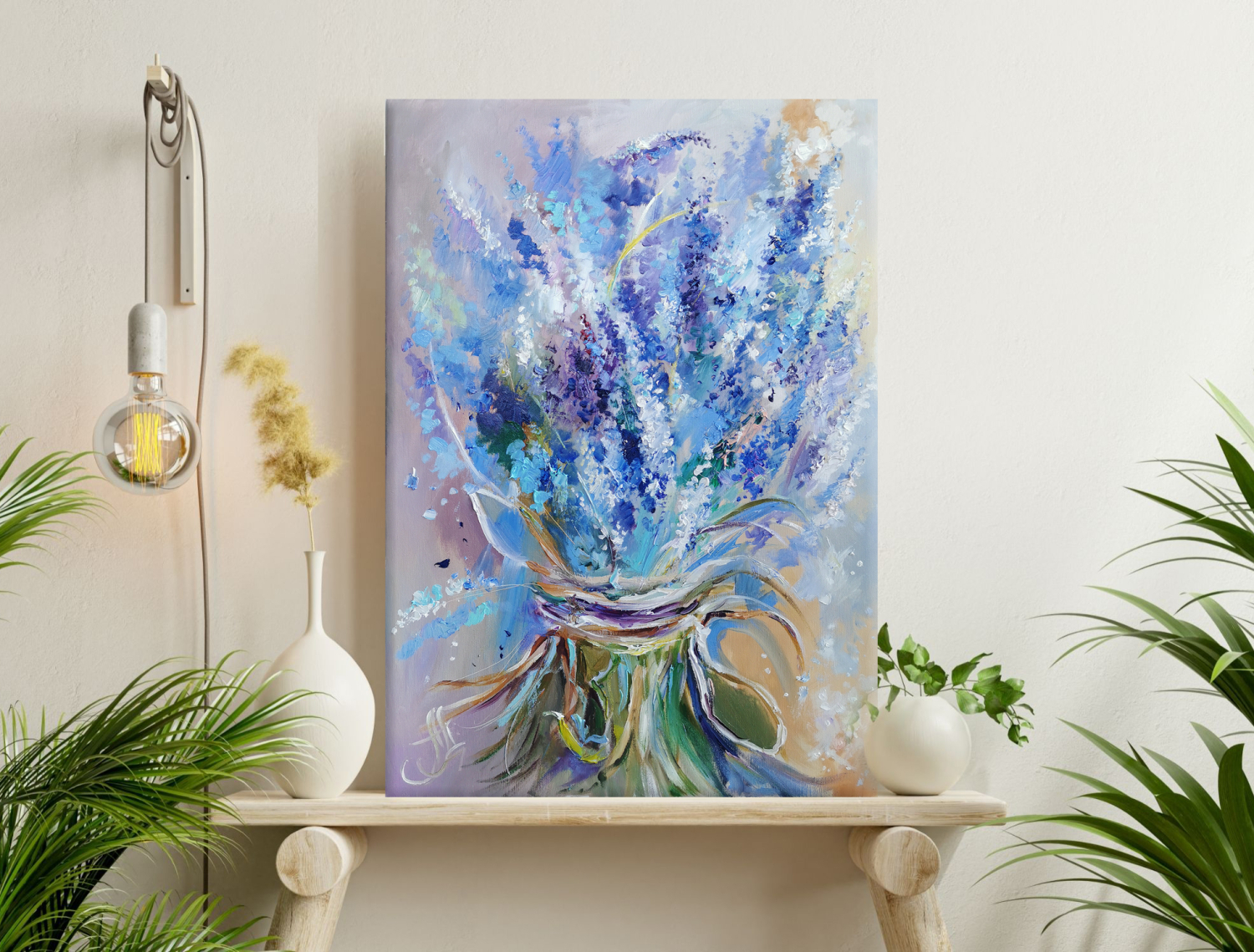 Gorgeous oil abstract painting with textural blue lavender flowers will enrich your interior. Artwork with a rich textured surface in the unique technique by Annet Loginova. It may be a wonderful gift for your family, your loved ones, friends, colleagues.