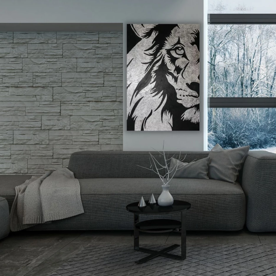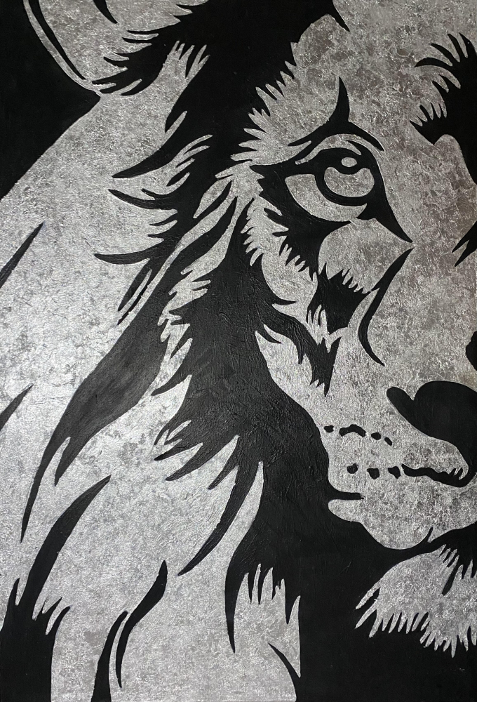 The lion represents courage, strength in overcoming difficulties. This painting is created with acrylic paints and silver leaf on canvas.