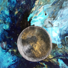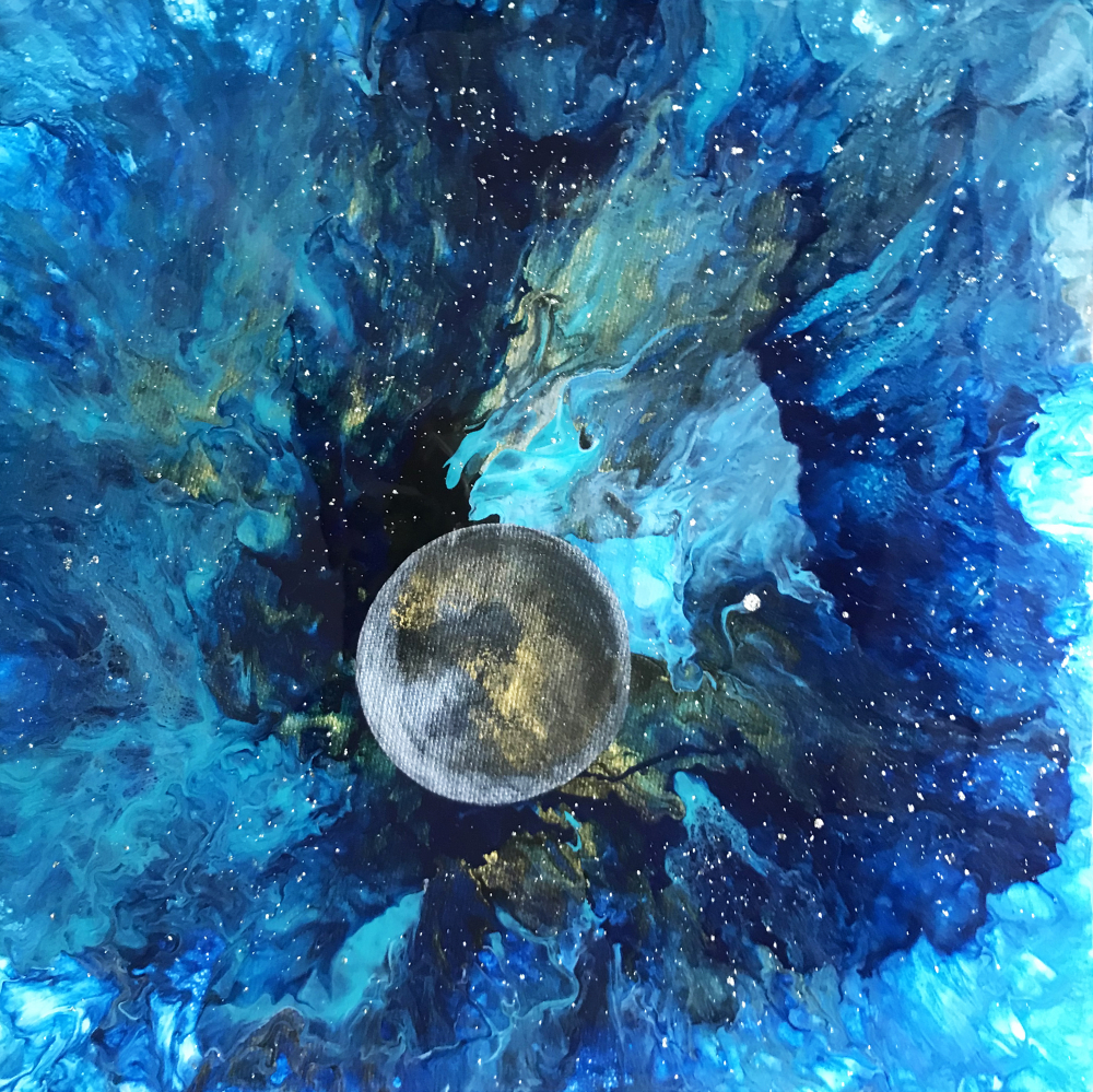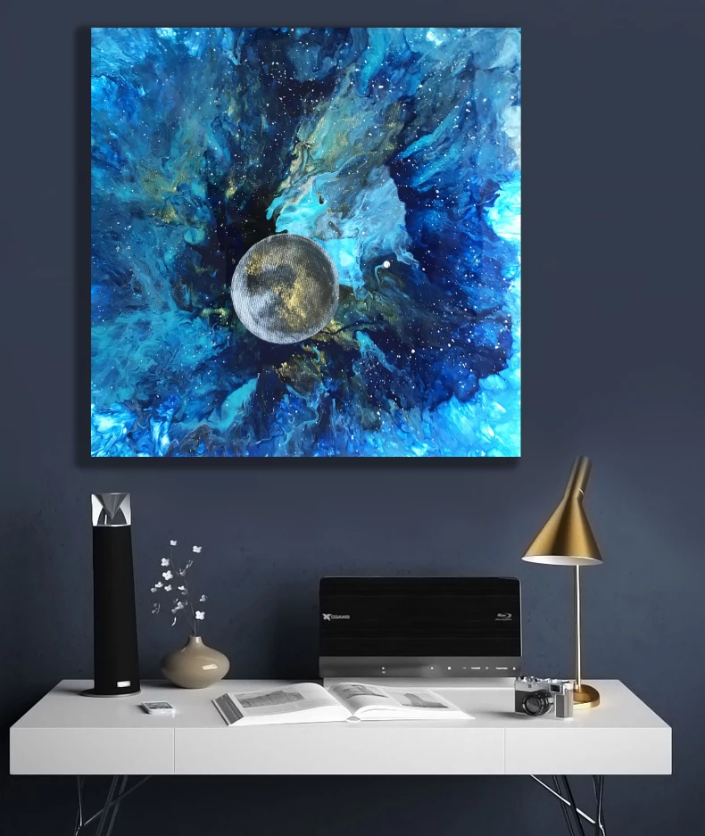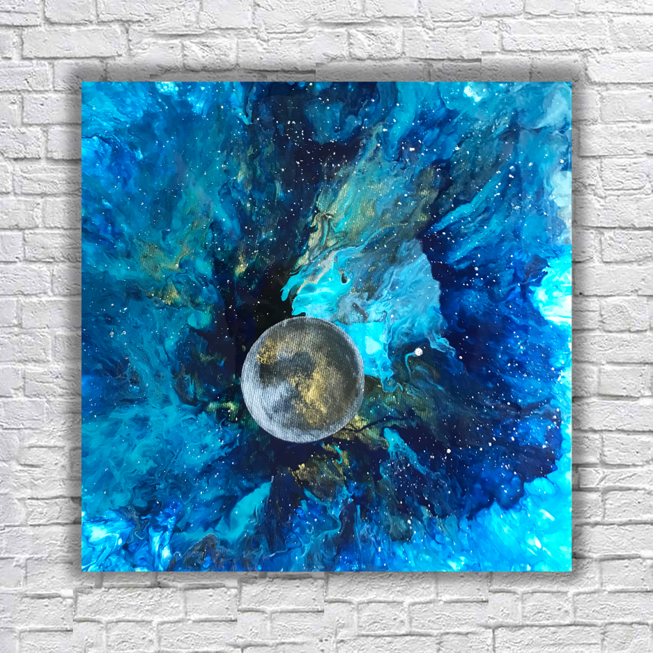 Deep in the space. Infinity and cold beauty of outer space. Harmonizes the room space, frees from unnecessary fuss. Fluid art, canvas on stretcher, acrylic paints, acrylic lacquer, golden potal