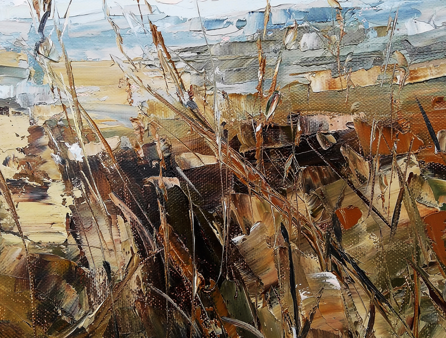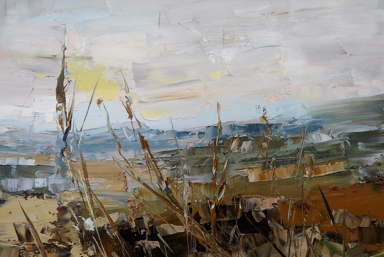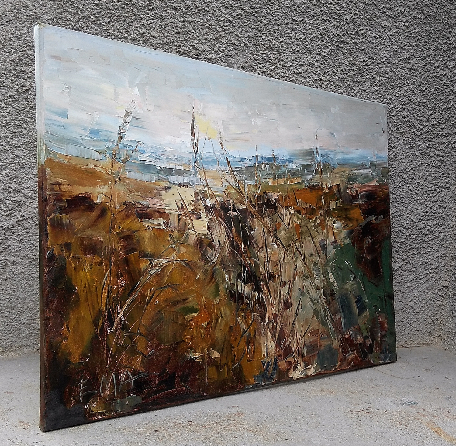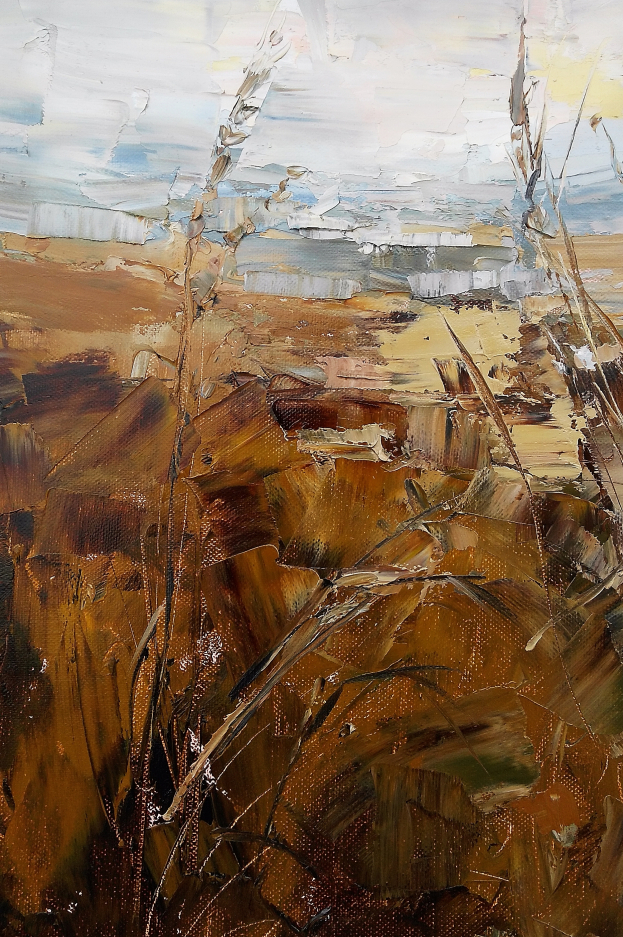 This painting is part of my field series. My freedom-loving personality was always been drawn by the fields. I love the feeling of endless, freedom and reverie that the fields evoke in me. I love painting them. While painting I feel the gentle wind playing all around me, I hear the whispers of the grass, I feel my soul floating towards the horizon… and I am happy. Hope you are too when looking at these paintings.