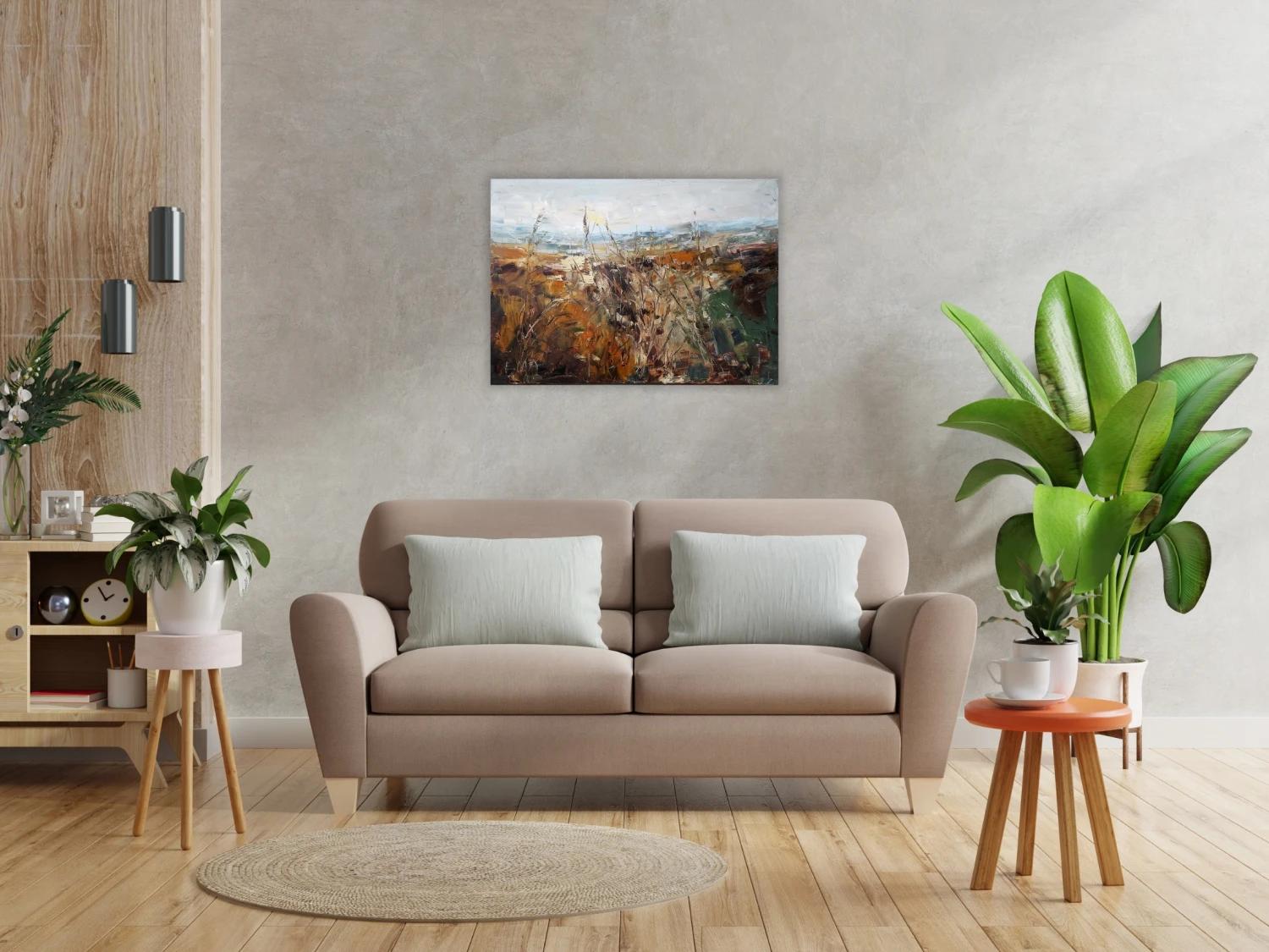 This original oil painting is done on stretched cotton canvas. Size 70x50cm. Depth 1 cm. Canvas is gallery wrapped and painted on the sides, so the painting could be hang as it is without a frame if preferred.