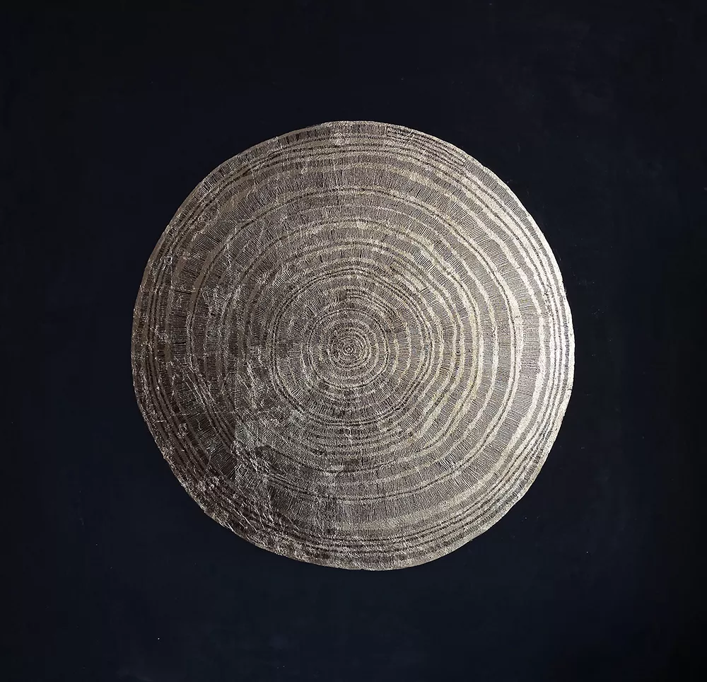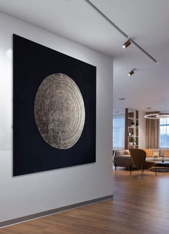 The inspiration for “Mantra” was simple shapes and a golden foil-rich shine effect. The medium that was used for this painting is mixed media and specifically a mix of graphics and painting. Because of its size and its aesthetic, it is enough to upgrade an entire space.