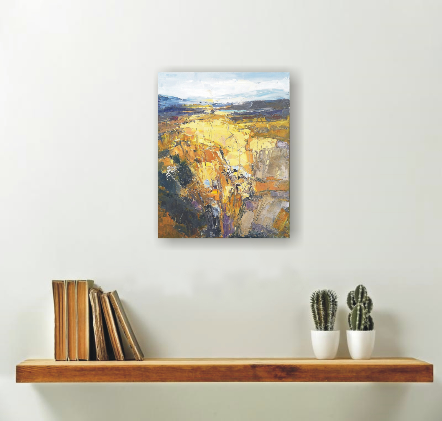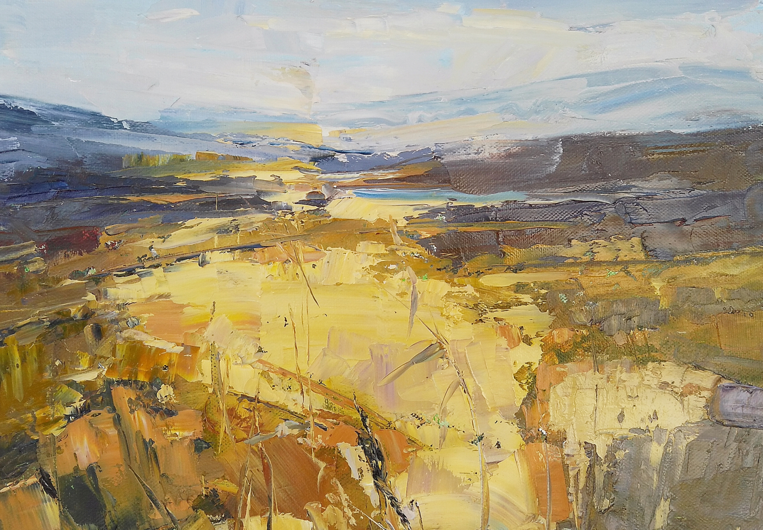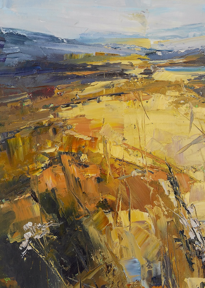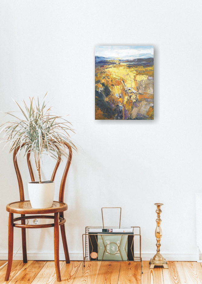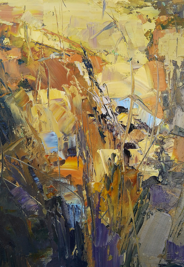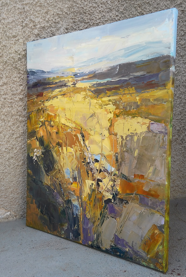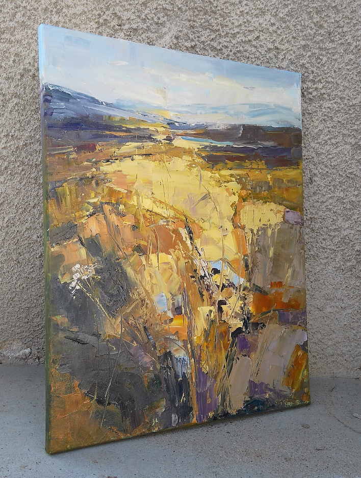 This painting is part of my field series. My freedom-loving personality was always been drawn by the fields. I love the feeling of endless, freedom and reverie that the fields evoke in me. I love painting them. While painting I feel the gentle wind playing all around me, I hear the whispers of the grass, I feel my soul floating towards the horizon… and I am happy. Hope you are too when looking at these paintings.