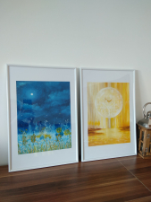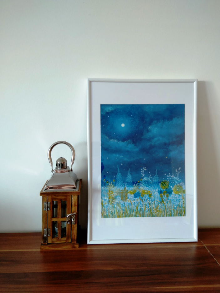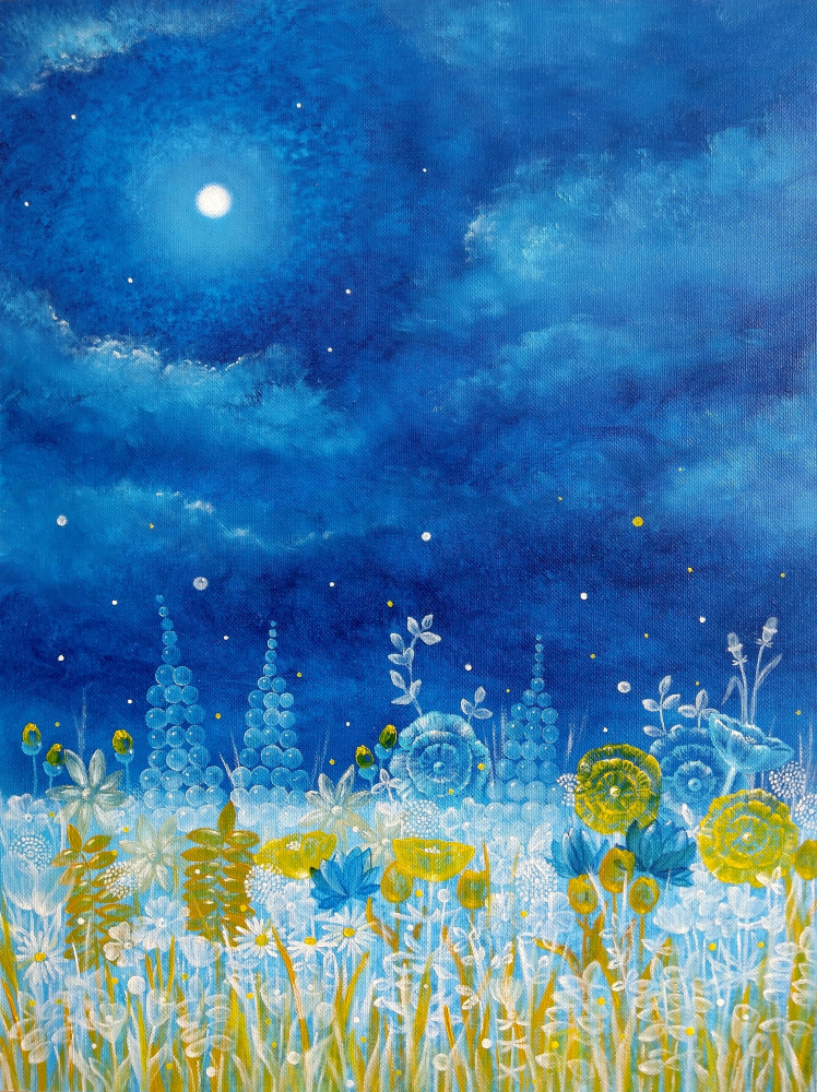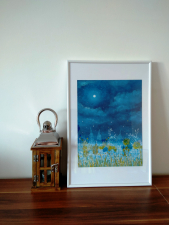 Meadow in fullmoon, oil painting. The meadow changes to fine matter at the full moon. Oil painting, paper 300 gr/m2. The painting is framed.