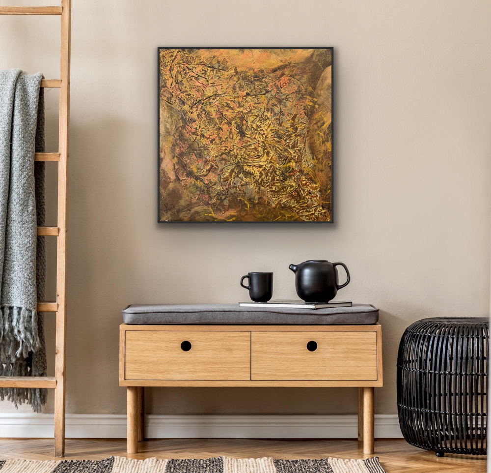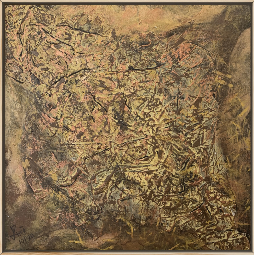 Earthy colors combined with the 3D layering of several materials and lines; all this together gives the painting its special dynamics. When creating the name, I got inspired by the ideas of several people. I love to know other people's perspectives and it is up to everyone what they see in the painting.