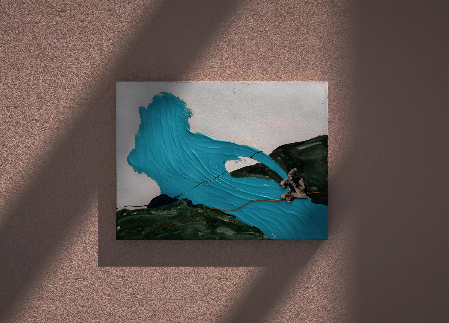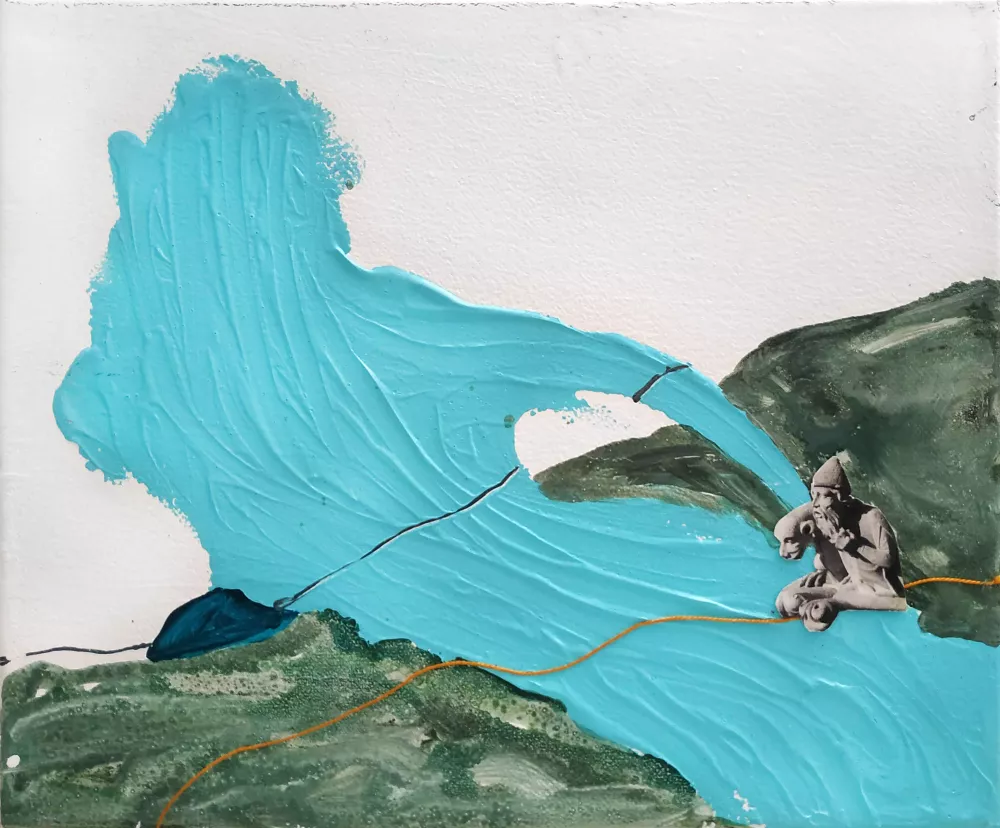 When I went to Paris I collected tickets, prospects, and newspapers. This figure on the artwork is a part of the Notre Dame ticket. I wanted to create a minimalist painting-collage mix with this element to project to viewers my time in Paris and the energy of the city.