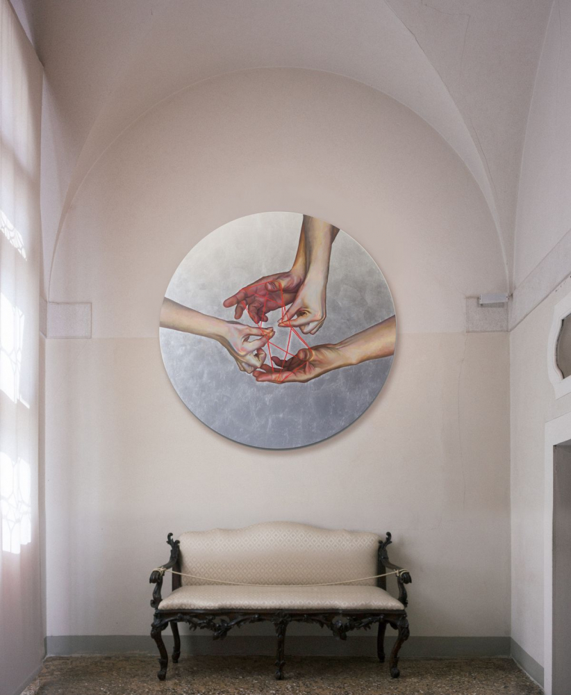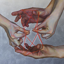 Paintings about the relationship between a man and a woman. The picture shows the male and female hands that play a game - a thread. This game symbolizes complex human relationships, and the threads with which they are connected show the intricacies of their relations, the game continues, and the relationship continues.