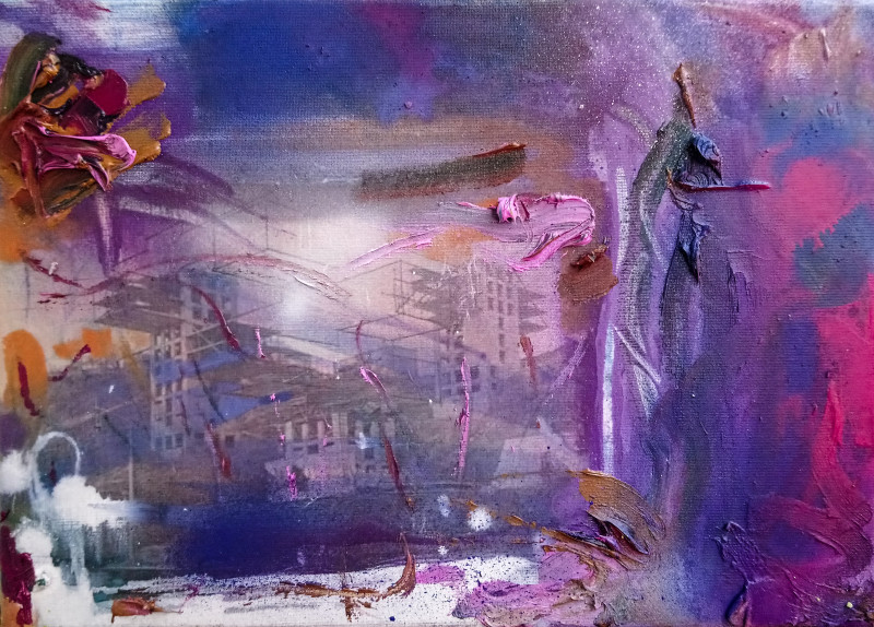Medium is a mixed media oil, enamel, spray paint, paper, and plastic film, made by transferring the image from paper and blue oxide. Material is a canvas on wood with paper and plastic film glued on.
