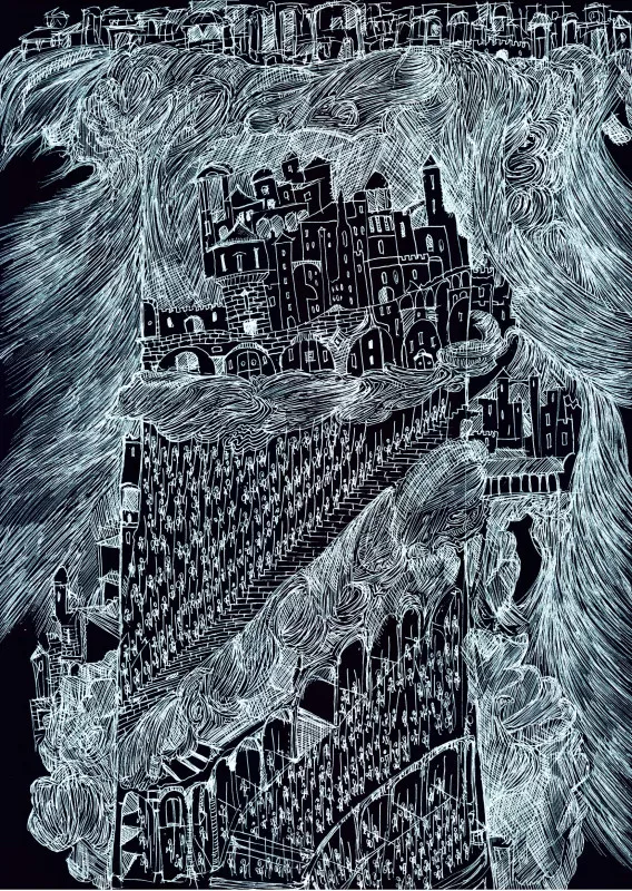 Moon is a conceptual liner drawing on paper with an abstract style. This drawing shows you how the moon reflects its glow on the world and with that, its mysterious atmosphere. It has the size of 30x40 cm and would work well in any space thanks to its optimal size.