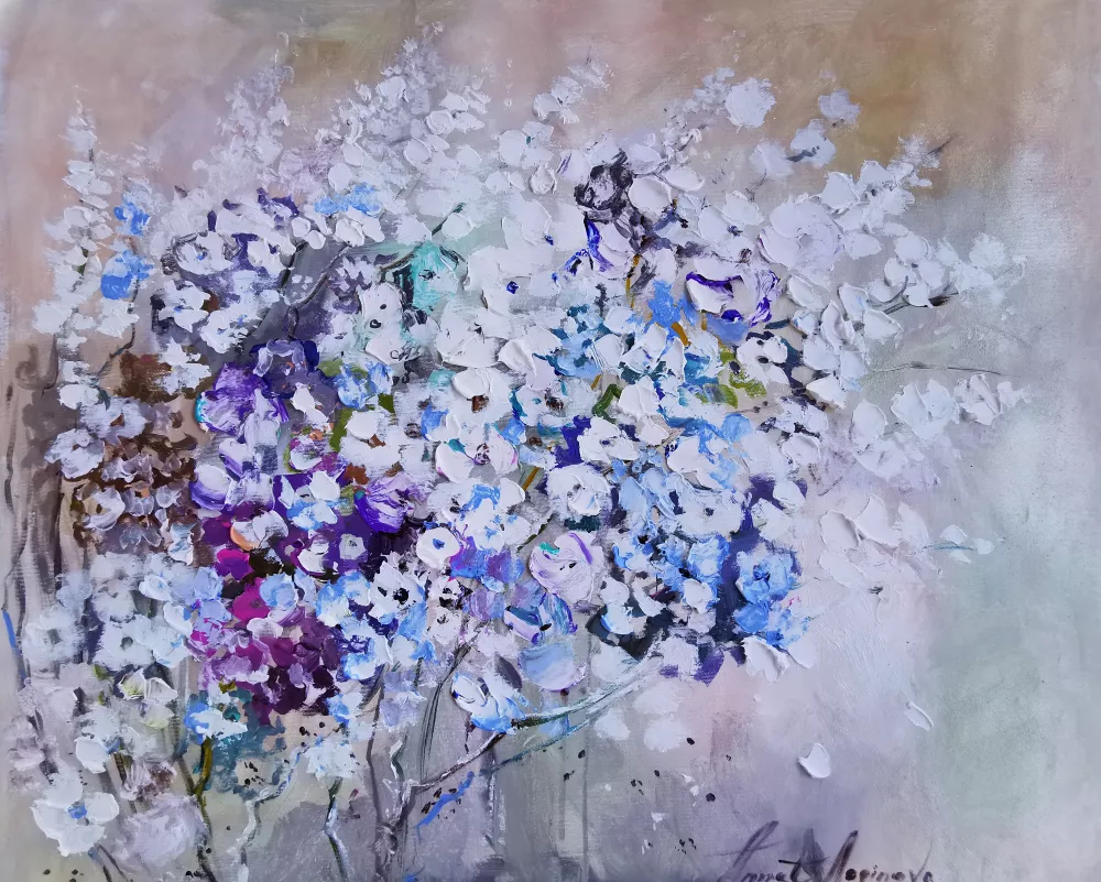 Lovely floral abstract painting with a rich textured surface created in oil & acrylic on canvas. This airy floral composition in delicate colors may be a gorgerous decoration for your living room or bedroom. It is also a wonderful gift for your family, your loved ones, friends, colleagues. Besides, it would be a great addition to your original paintings collection.