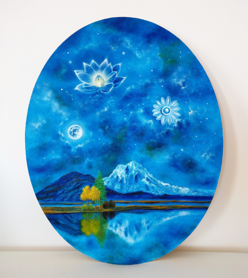 “Night flowers” is an oil painting with surrealistic style and was created on canvas. It is inspired by nature but with a more mythical approach. The vibrant colors of the artwork boost your energy and create happy feelings.