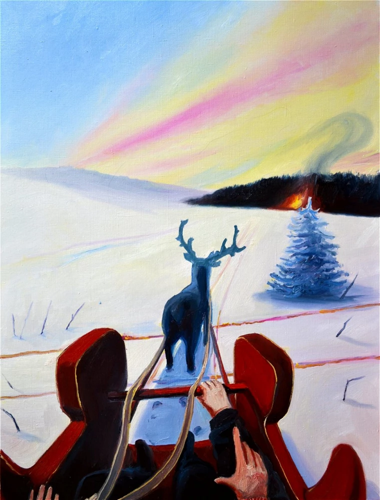 Painting based on one of my dreams. In an empty, northern landscape, I was riding a sledge with some guy behind me. I didn't see his face, but he was familiar and I felt good with him. The landscape was beautiful and calm, until we saw a fire on the horizon. When we came near, we found a lot of snakes and gnomes, setting the beautiful forest on fire. We tried to fight them, helping each other in order to save the woods.