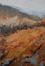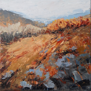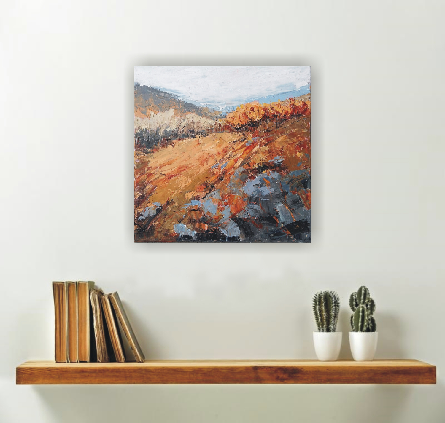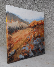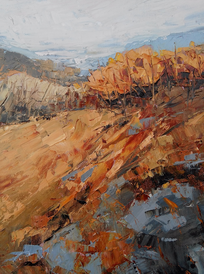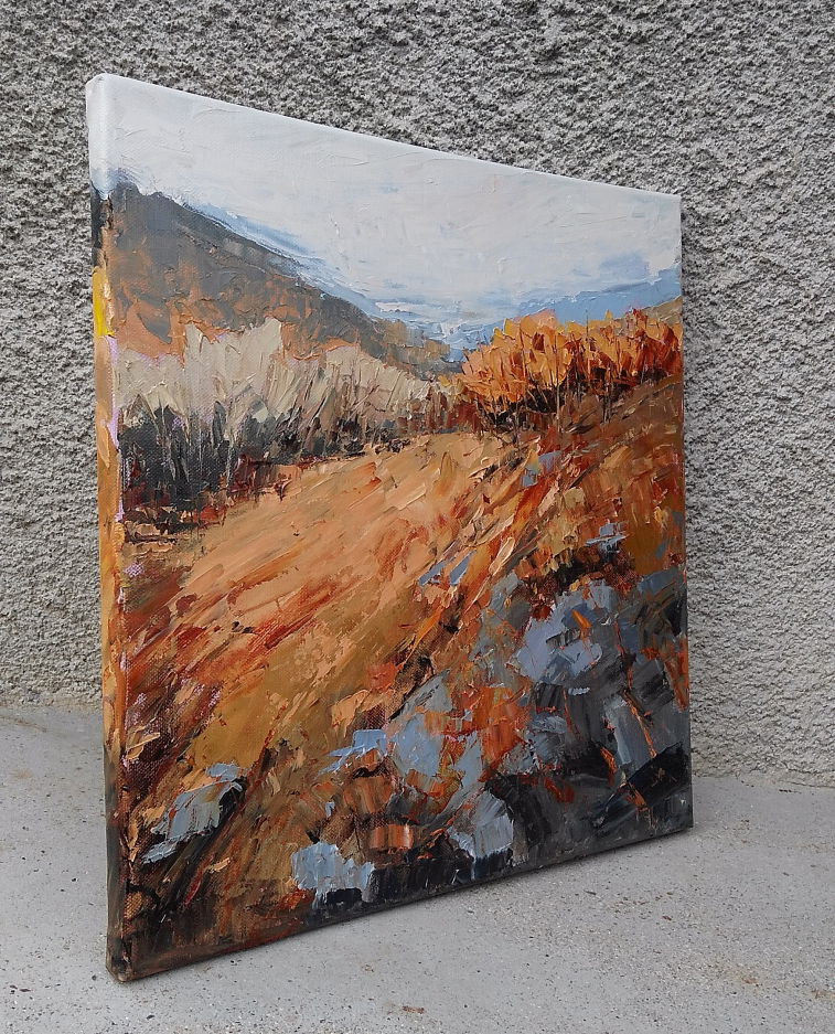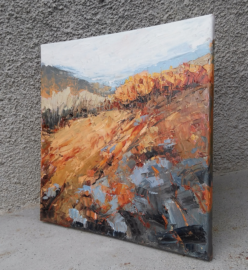 This painting is part of my series Autumn Stages. It is all about my love for the Autumn and how differently beautiful she might be. Early Autumn is shining in her golden bold hues. She is full of joy, sun shine and warm shaded. Late autumn is her melancholic sister. Colors have faded, no more