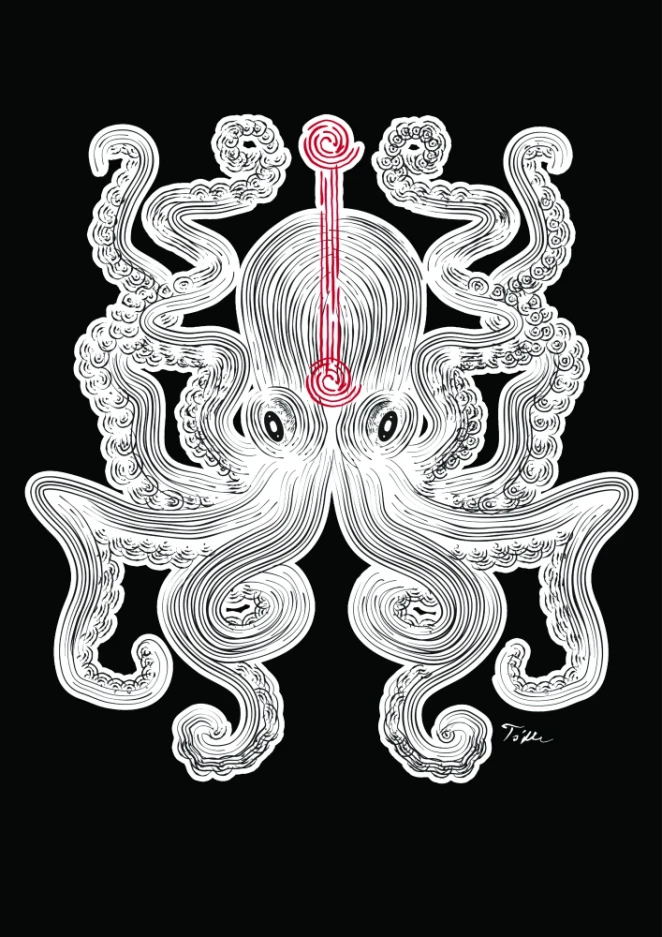 Octopuses have long been associated with various cultural and symbolic meanings, from intelligence and adaptability to mystery, transformation and serves as a reminder of the beauty and complexity of the underwater world. Incorporating these symbolic elements into an octopus drawing add depth and inspiring viewer to explore the deeper significance behind the image.This artwork inspired by capturing the essence of the octopus's fluidity and intelligence. It affects the viewer by unleashing the mysteries of the deep dive into the captivating world of octopus and unlock the secrets of these enigmatic creatures. It spurs the observer the embrace the spontaneity of ink and let it flow freely across the page and his enviroment, creating thoughts that evoke the octopus's mysterious aura. The expressive eyes of the octopus, rendered with delicate linocut lines seem to gaze directly at the observer, creating an intimate connection that transcends the boundaries of the canvas. The carved lines motivate the viewer to dive into the mysterious depths of the ocean and encourages him to reflect on their relationship with nature and the need for conservation.