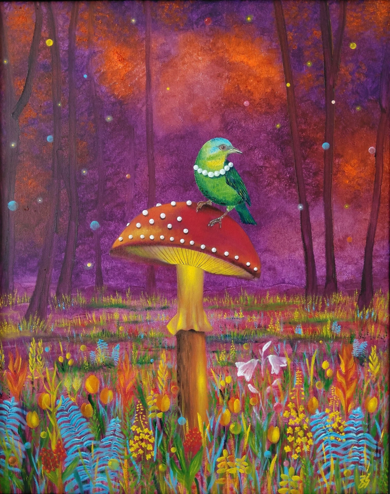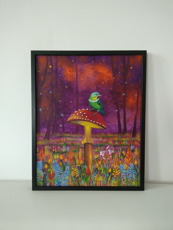 Oil painting, surrealism. Bird collecting toadstool beads in your necklace. If you like fairy tales, this is the painting for you. The painting has beautiful colors and is framed.