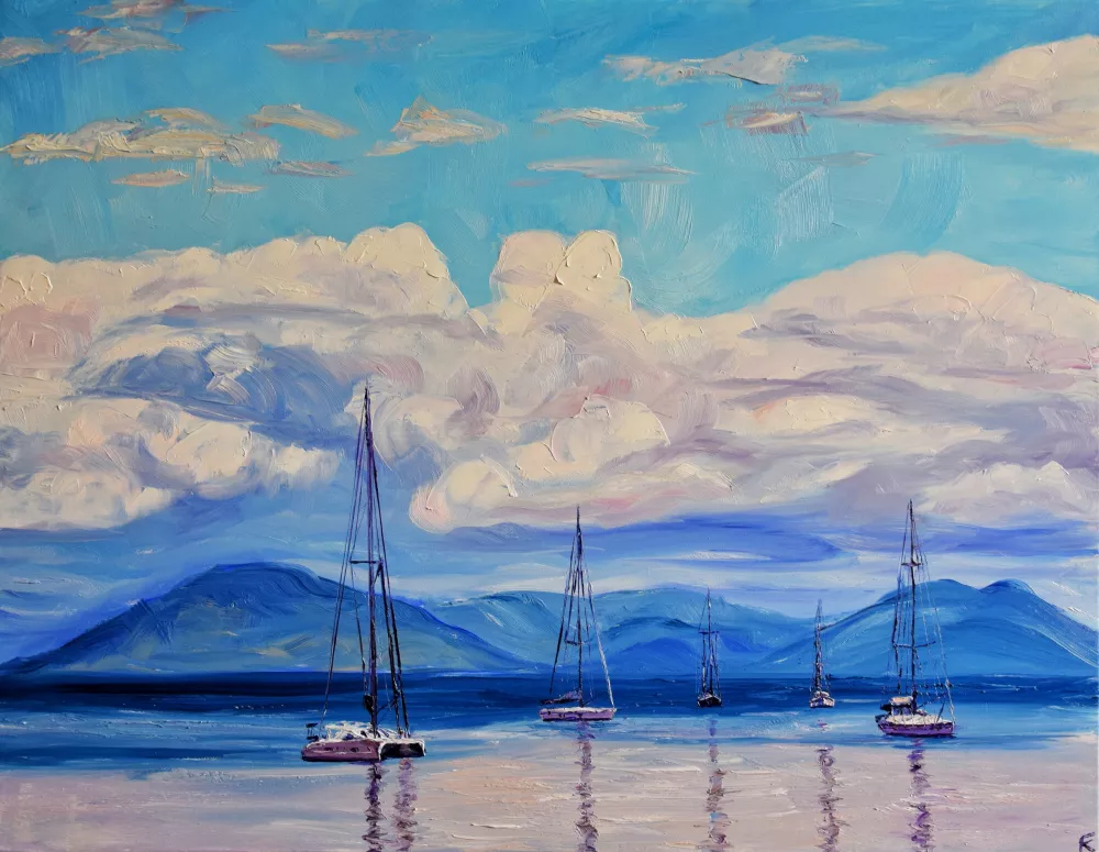 Seascape large original oil painting on canvas with ships on Corfu Island, Greece. I saw these clouds on Corfu almost every day and they are the most beautiful ones, which I have ever seen.