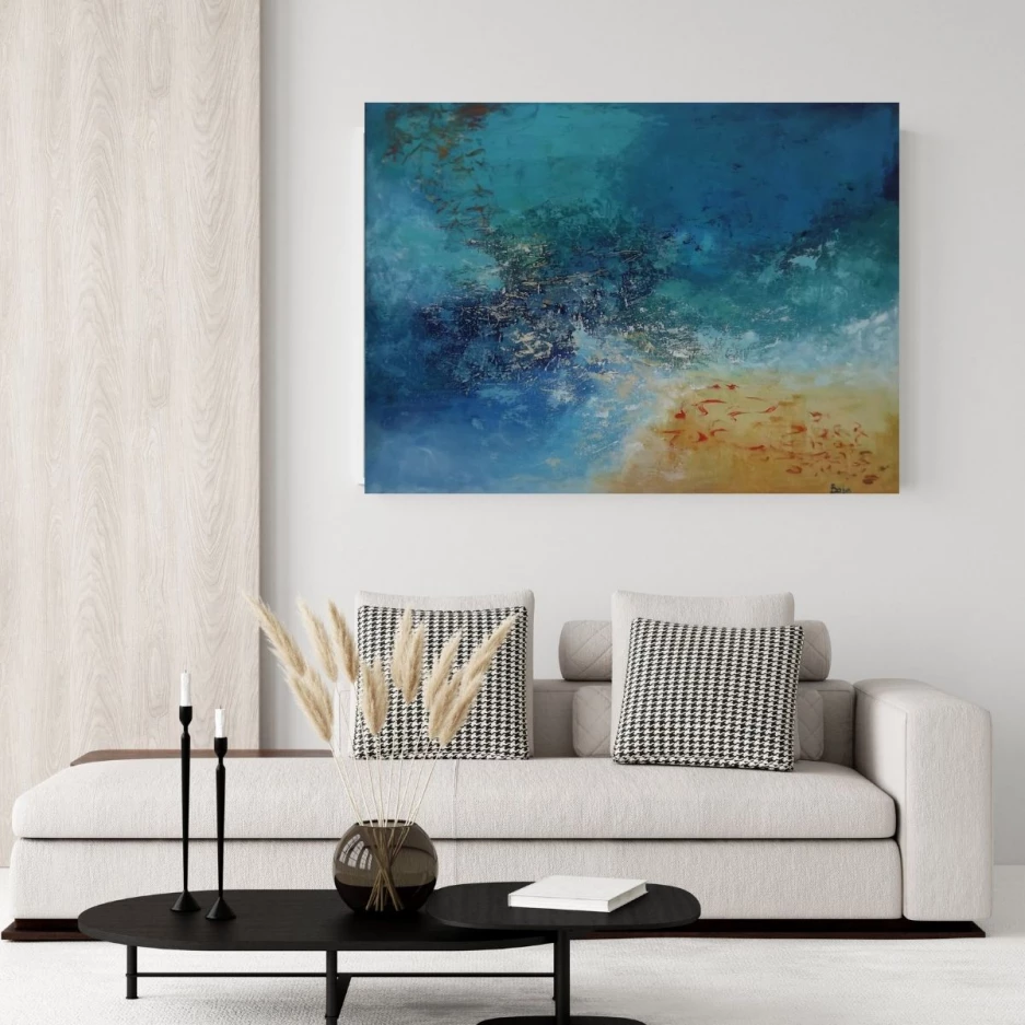 This painting depicts the calmness of escapism one feels when out in the vast ocean, out of reach. All you ever need to do when you want to be with yourself - is to get out of reach - out in the open sea, surrounded by music of the waves, the broadness of sky, the warmth of the Sun… So allow this painting to do that for you by placing it in any room.