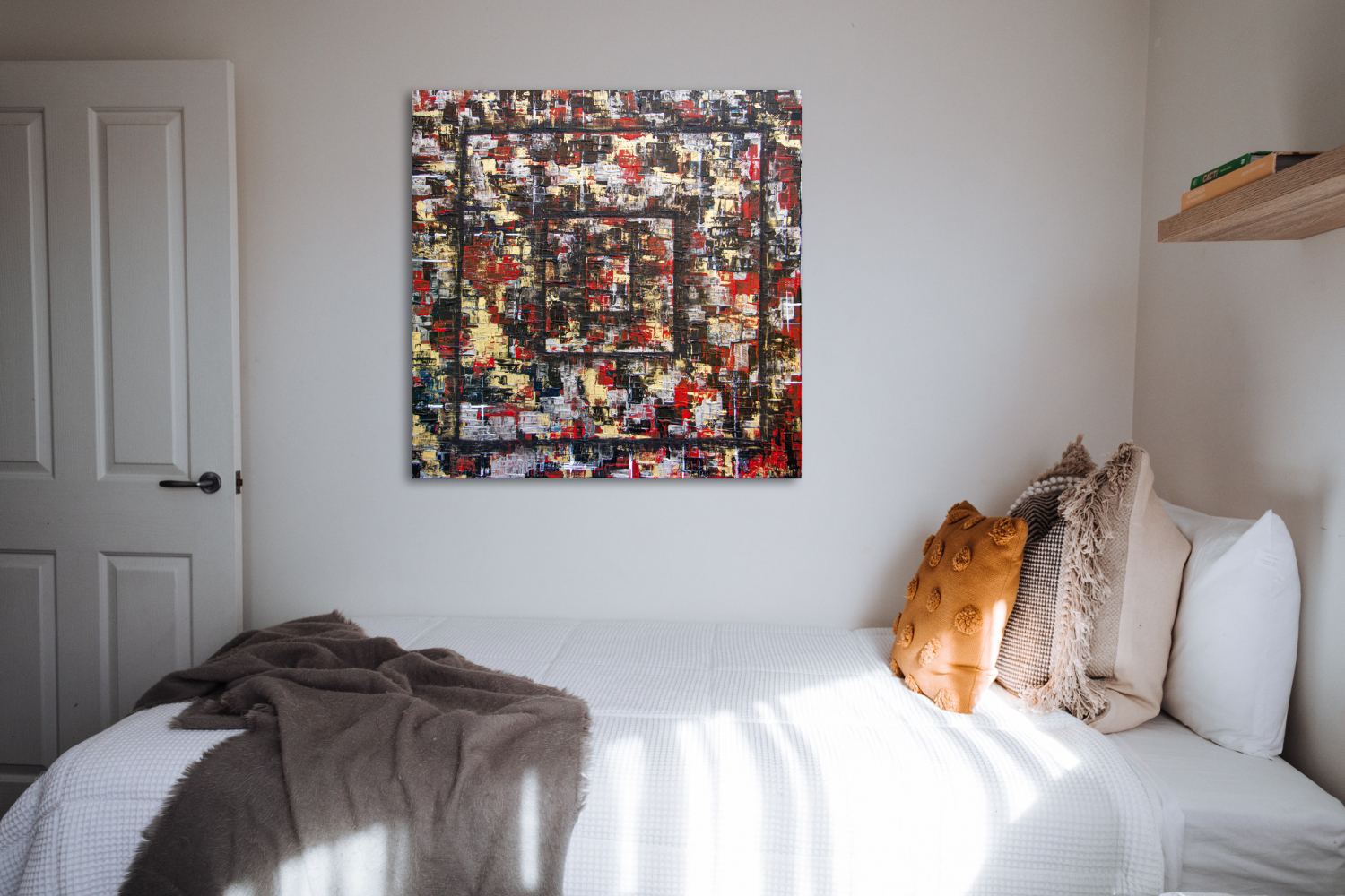 This abstract piece challenges the experience of depth perception with its’ fascinating 3D effect, textures, and warm colour palette. Introduce an intriguing warm energy into your space with this work of art.