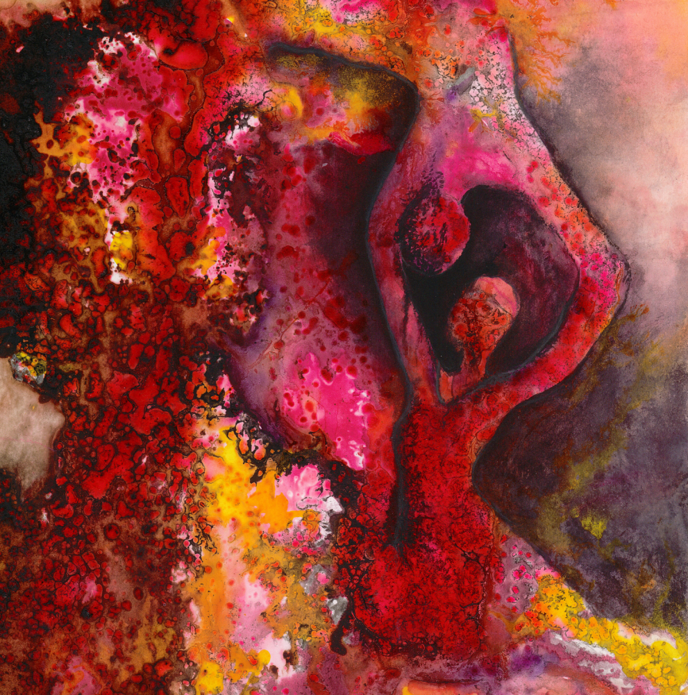 Connective dance, like a soft invisible connective tissue made of airy atoms. Cannot be understood, can only be felt, can only be danced around. To dance, to touch, to connect with another person is just a way to connect with oneself. This is what I feel when looking at this painting, the warm fiery colors of connection emerging from the dark matter of loneliness.