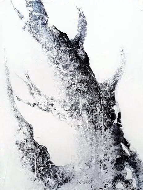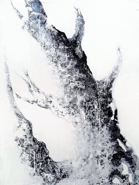 This painting has a rough texture of the white paint and it plays very well with the semi-undefined ink-shaped tree.