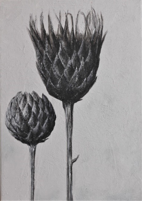 This painting is the third of the series “ Grey Matters”. This series consists of acrylic paintings on canvas that illustrate the world of botanical shapes caught in black and white and shades of grey. Because grey matters too.