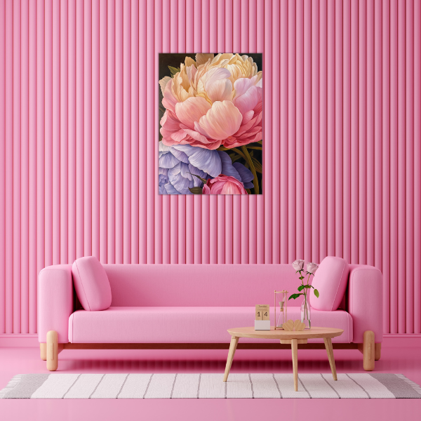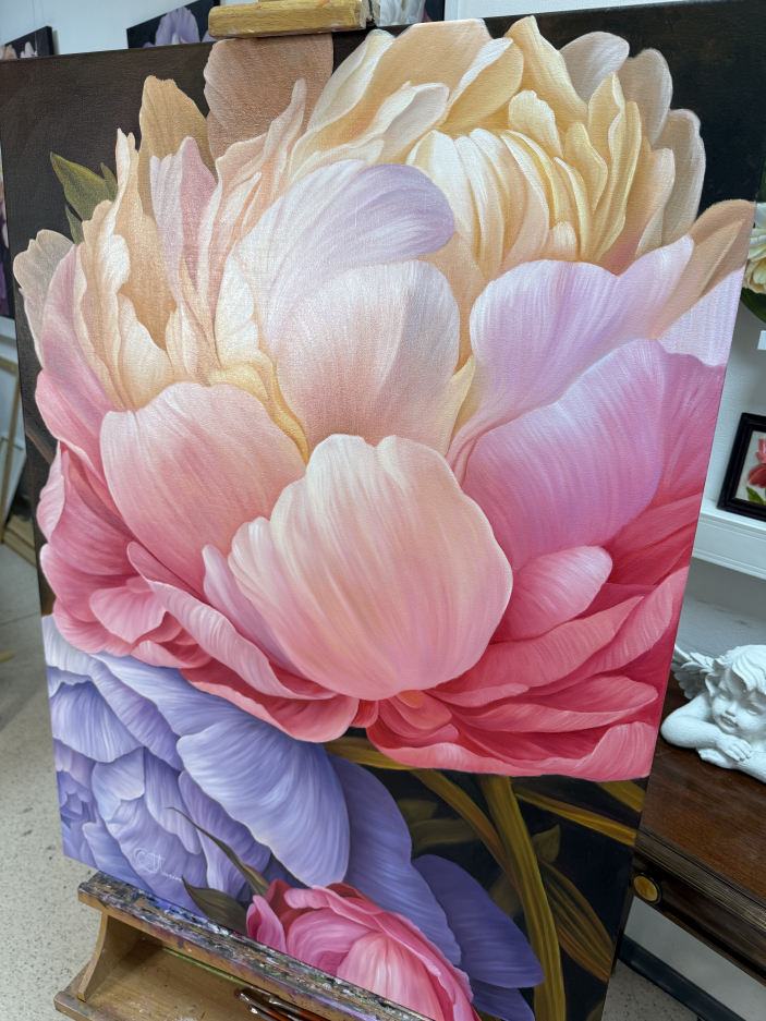 This work is a hymn to tenderness and femininity. Large peonies, painted with exquisite detail, combine warm peachy-pink tones with cool lavender shades, creating depth and a sense of soft, vibrant movement. Subtle transitions, delicate textures, and exquisite lighting bring the flowers to life. They will make the perfect accent for a contemporary interior, bringing tranquility, elegance, and a soft glow to any space.