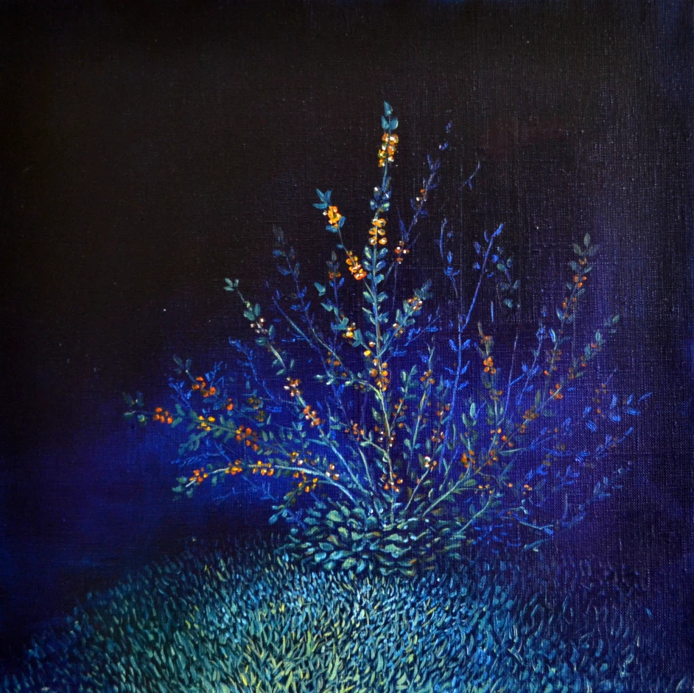 This plant is part of a long-time project, where Klara is depicting all drawings from the botanical section of the Voynich manuscript, the cryptic book from the 14th century. Plant from Elsewhere at Night is based on the sheet number 21 of Voynich manuscript.
