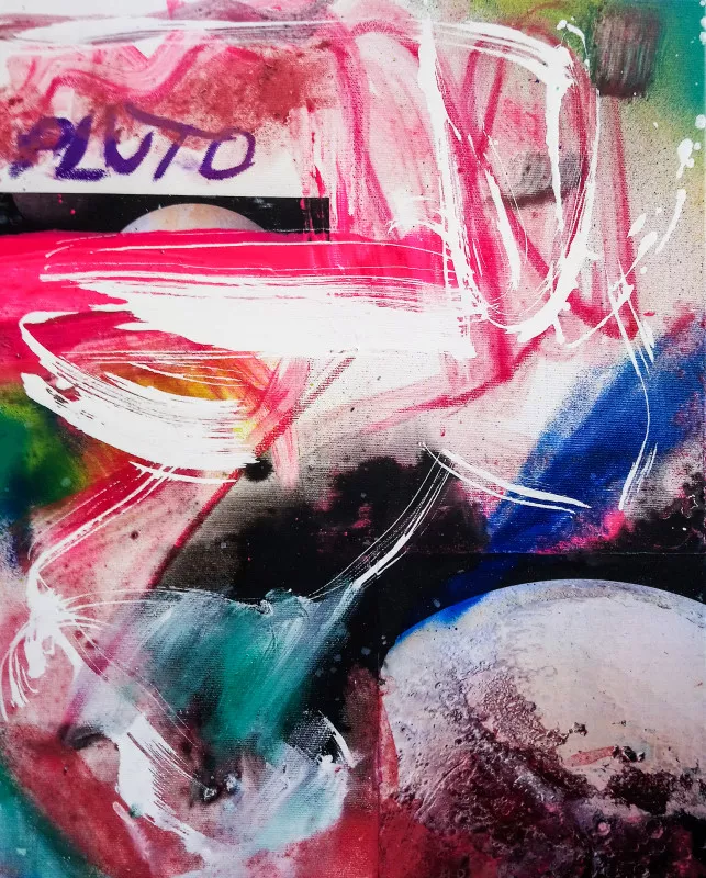 Medium is a mixed media oil, enamel, spray paint, paper, and plastic film, made by transferring the image from paper and blue oxide. Material is a canvas on wood with paper and plastic film glued on.