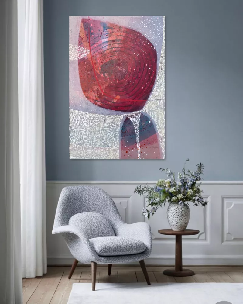 Red line/red is a painting with an expressionistic and abstract style. The paint used for this beautiful painting is acrylic and it was painted on canvas. The artist made a collection of paintings that are connected by the red line. This one is red and magenta and it shows the power of our roots.