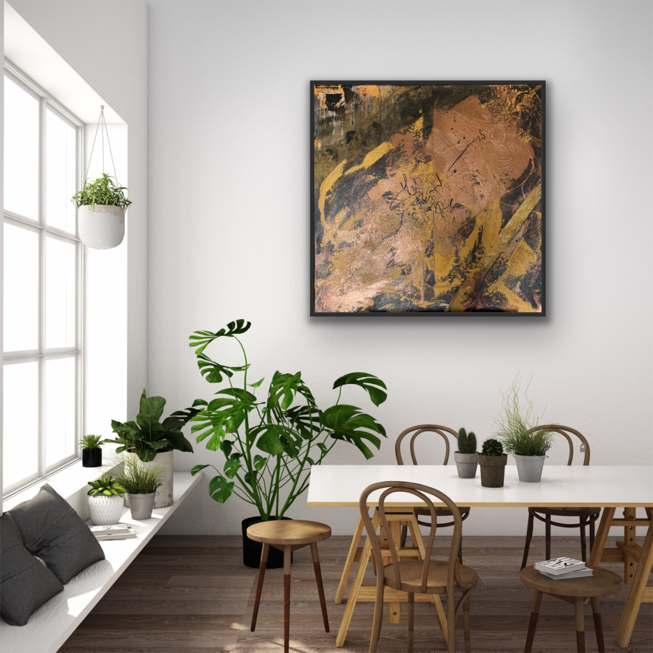 A mixture of earthy shades and dark spots passing to the highlight of the image with metallic colors, with direct and indirect strokes. Fine detail of handwriting in the middle was created by the spontaneous stroke of my hand. A message for everyone who finds their own meaning in the painting.