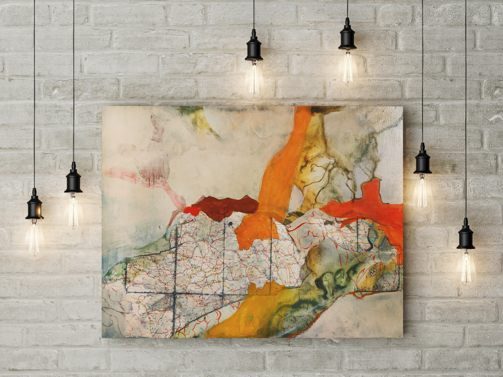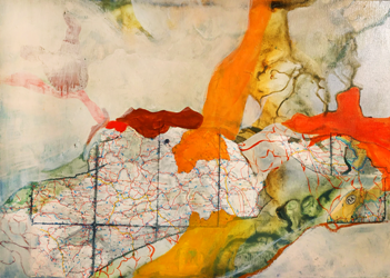 I found this map on a Romanian jumble sale and I always loved the maps especially the old maps with oldish-yellowish papers. I combined the map's abstraction with my gestures and it became a new artwork. I used the borderlines and the natural forms to make a complete painting.
